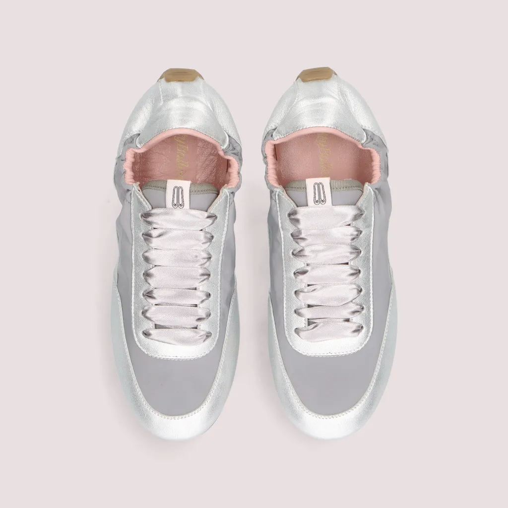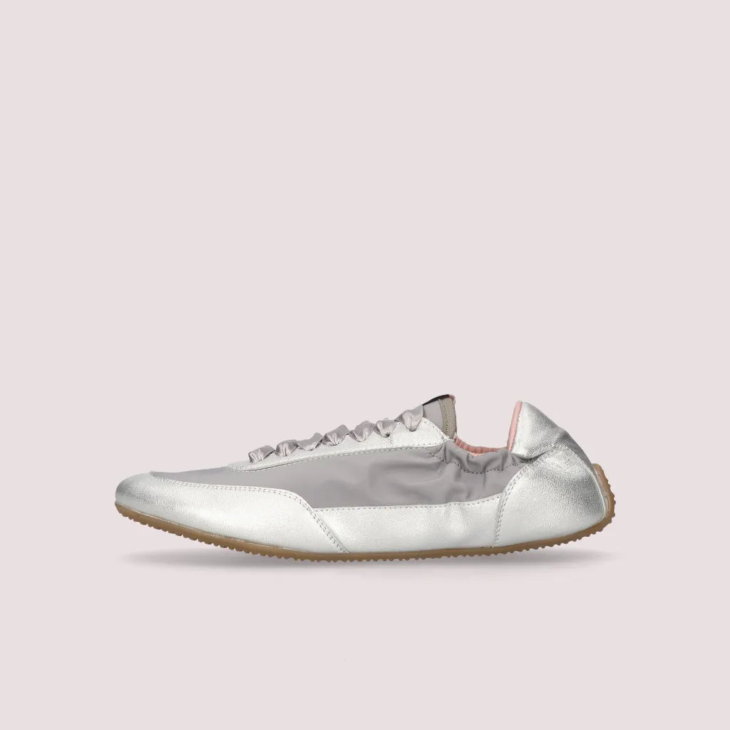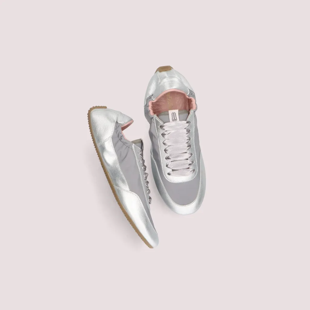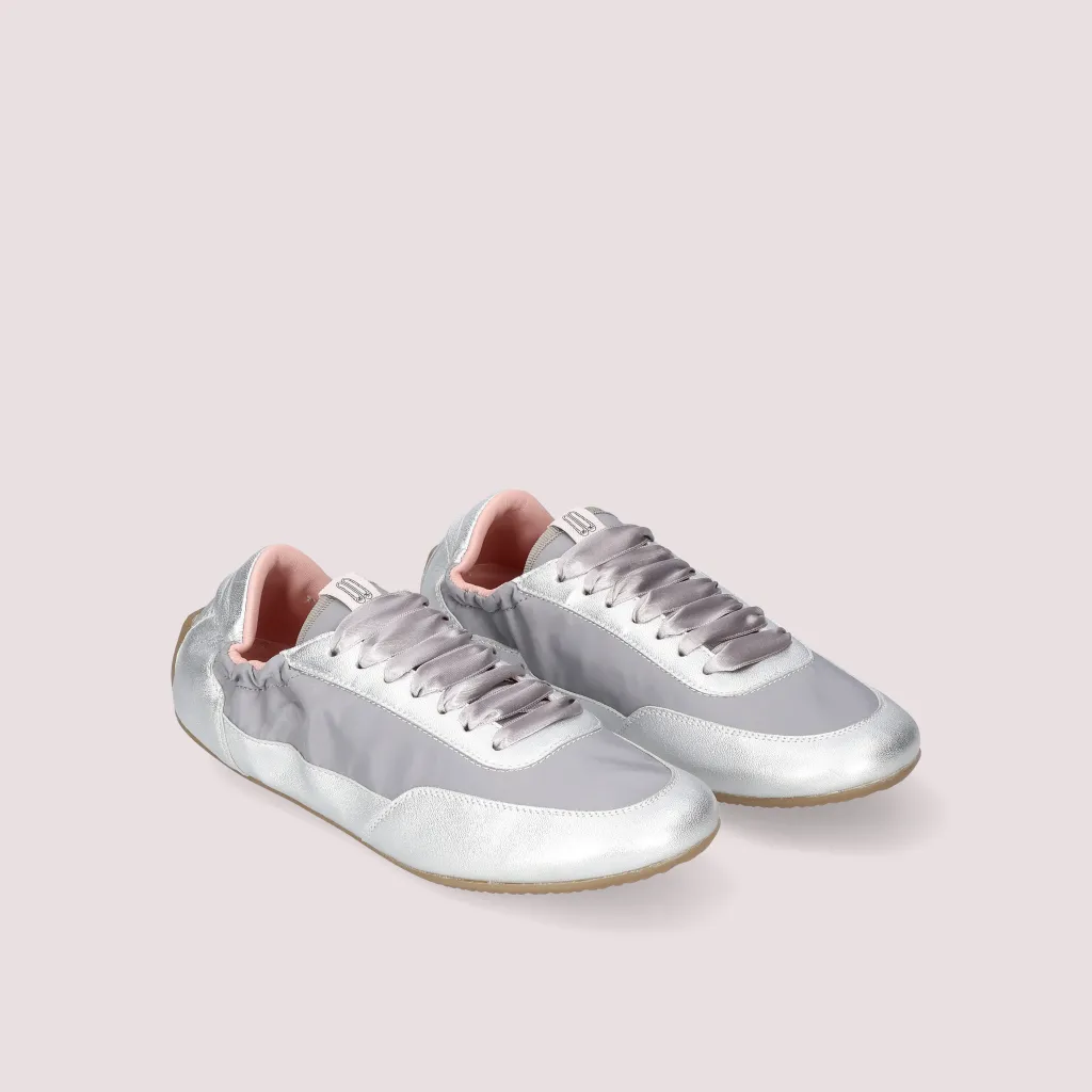 סניקרס מעור בצבע כסף משולב בבד סטרץ כסוף ושרוכי סאטן אפורים