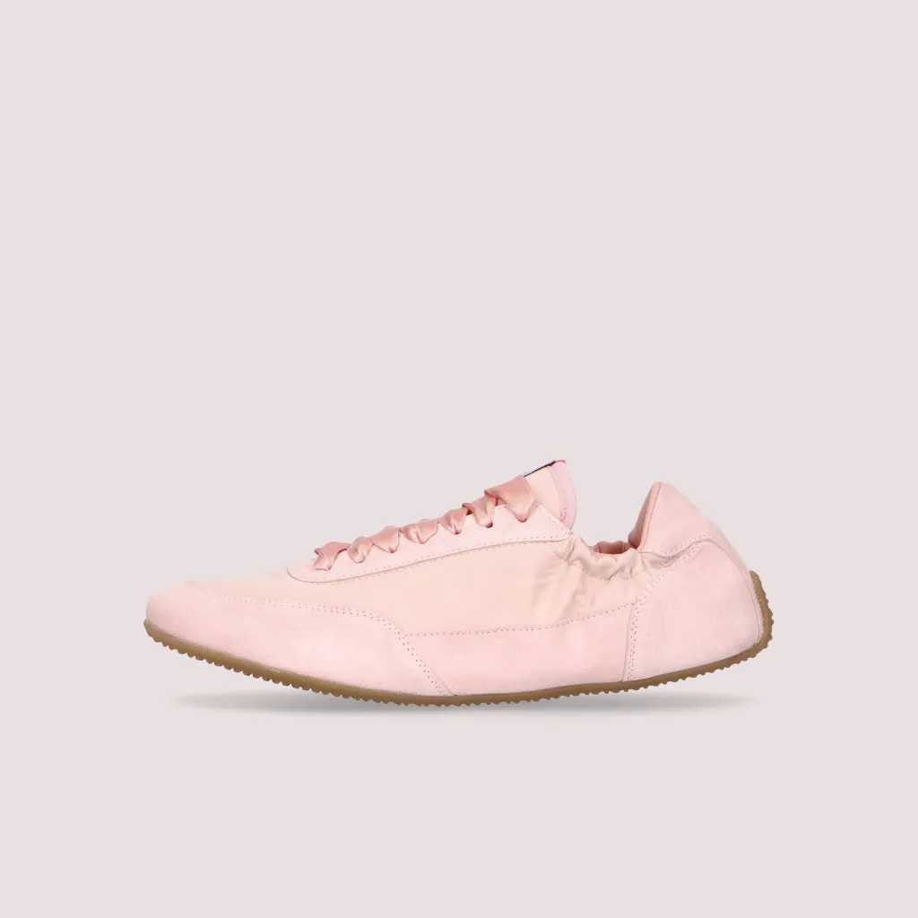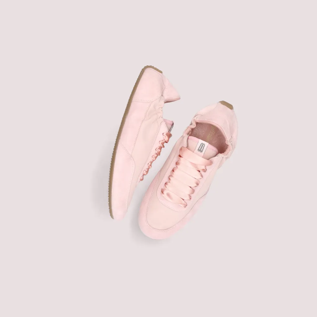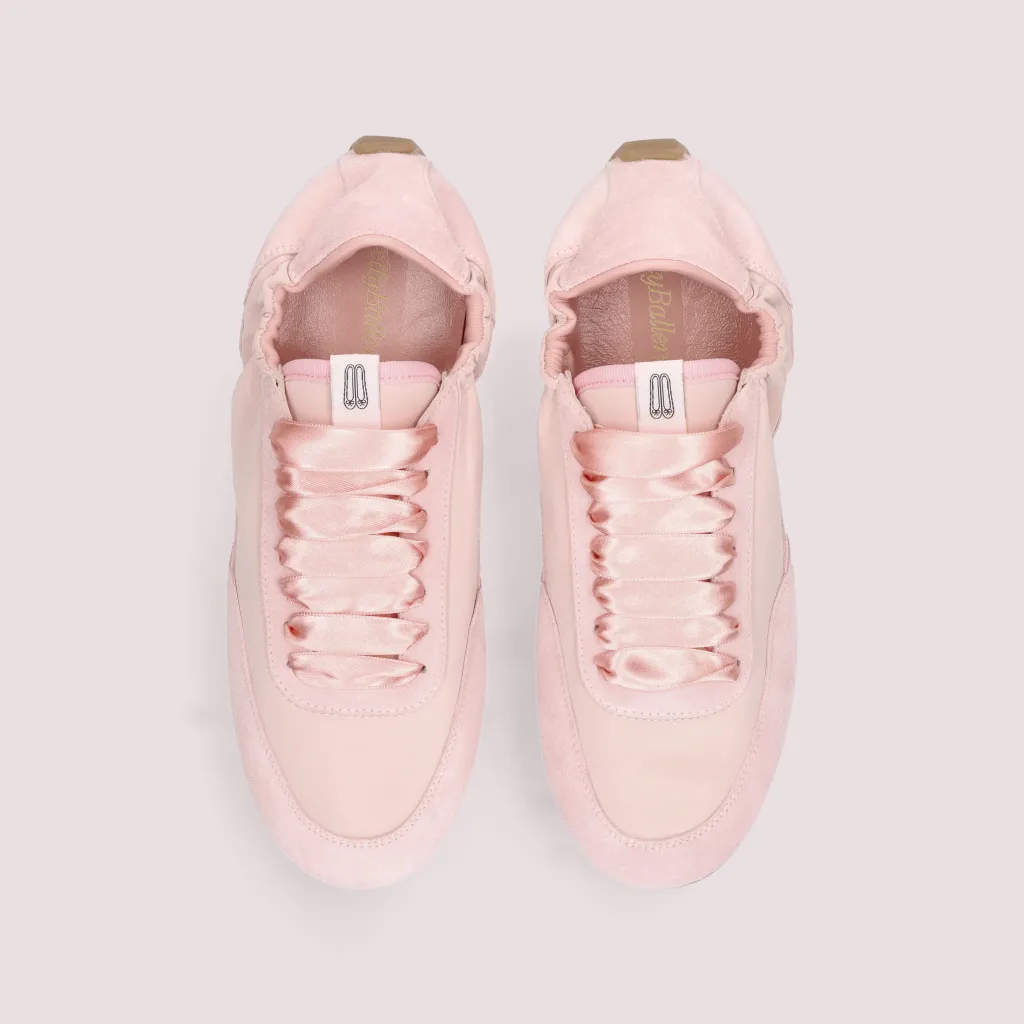 סניקרס מעור בצבע ורוד משולב בבד סטרץ ורוד ושרוכי סאטן ורודים