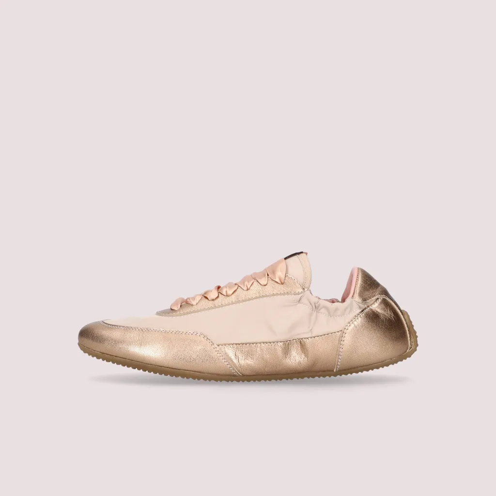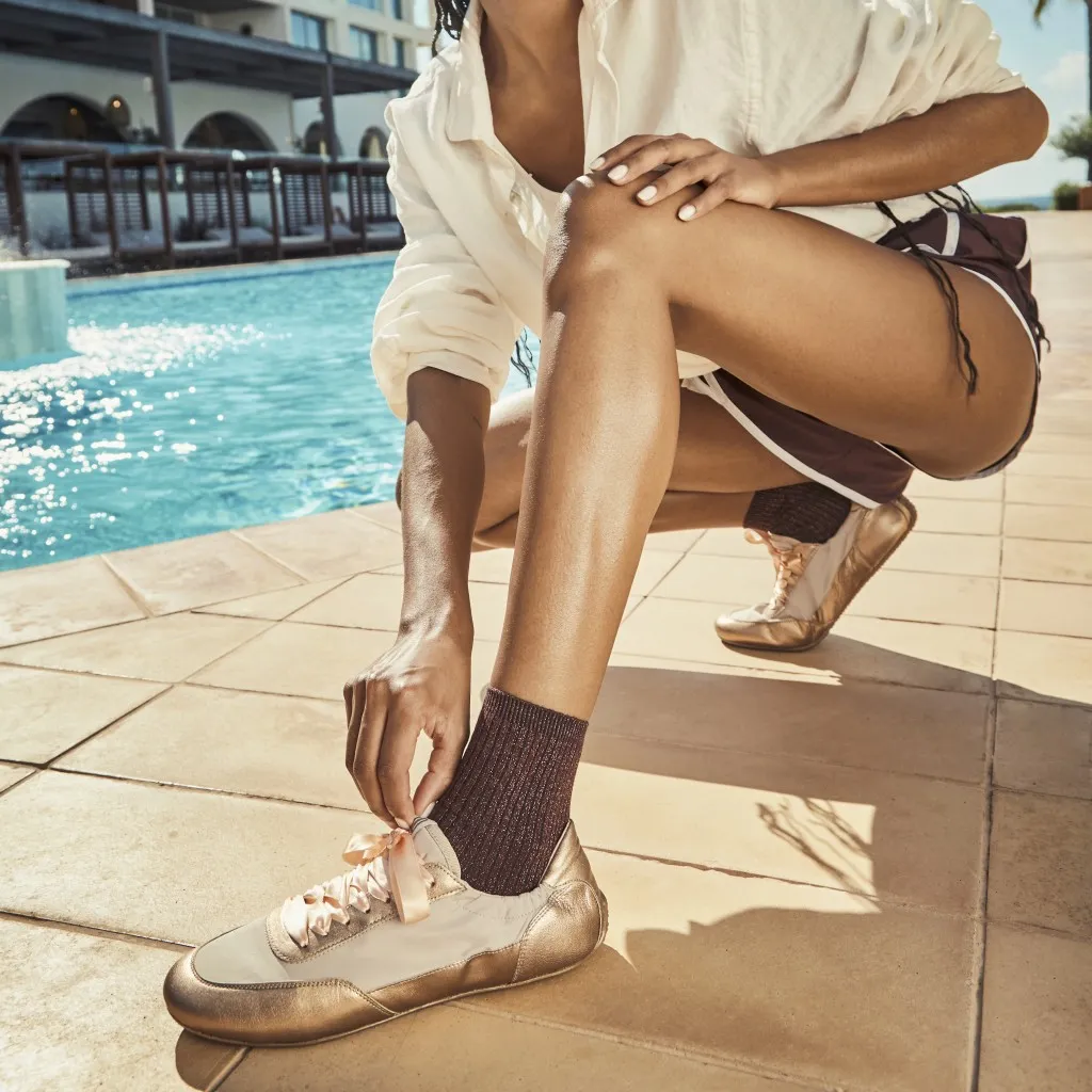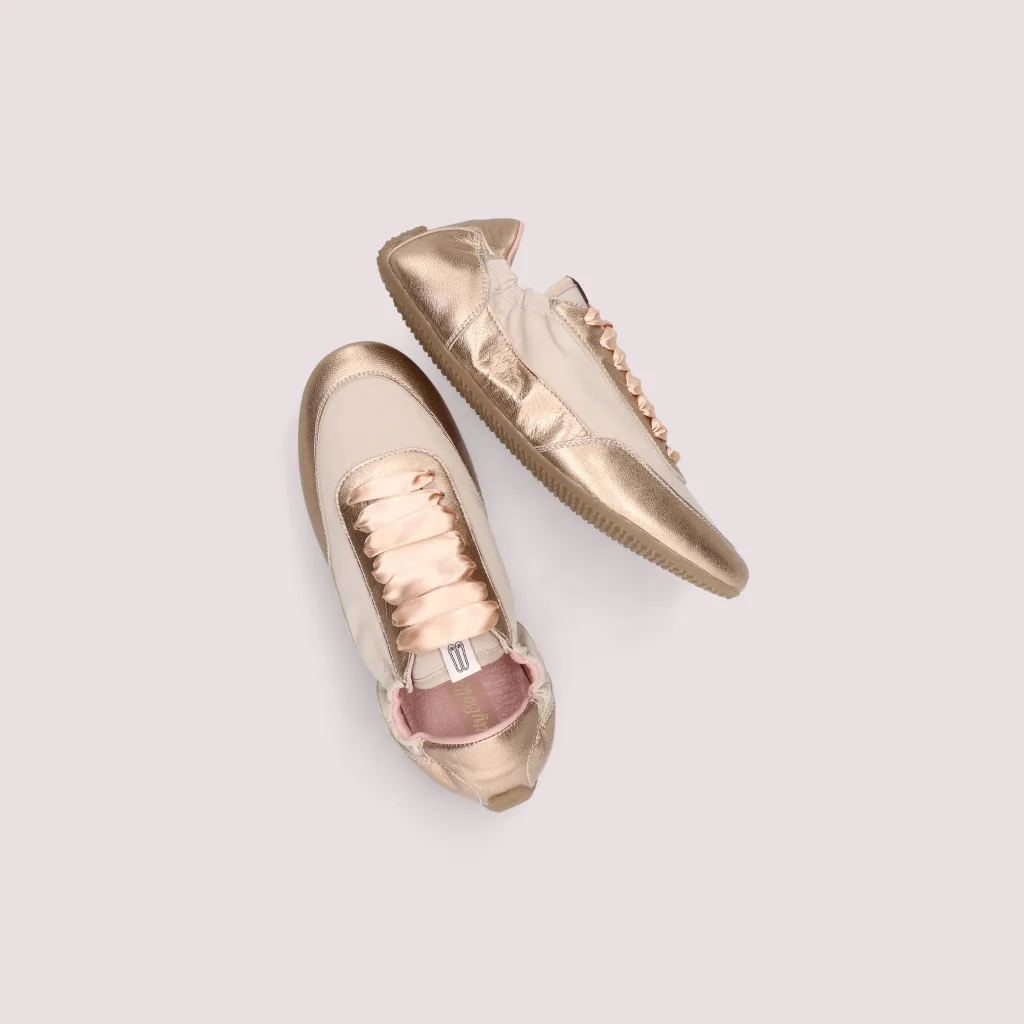 סניקרס מעור בצבע כזהב משולב בבד סטרץ זהוב ושרוכי סאטן תואמים