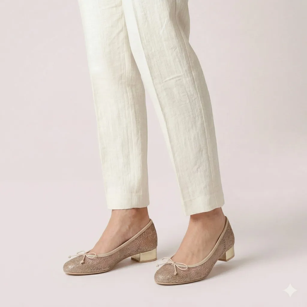 נעלי עקב מרשת מחוטי זהב בניצנוץ קל עם סרט ופפיון תואמים. עם עקב מעור זהב בגובה של 3 סמ’