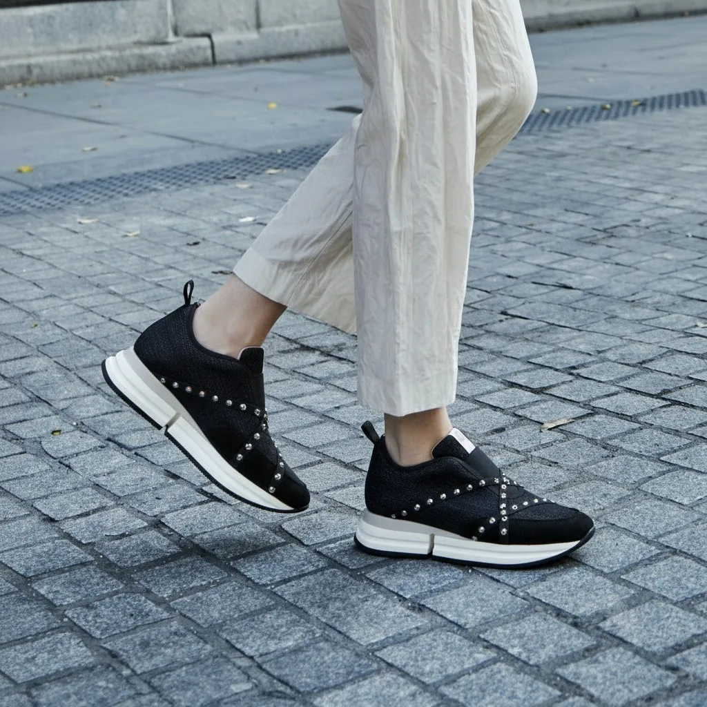 סניקרס מטקסטיל סטרץ’ שחור וחרטום זמש שחור וכן רצועות של אבני סברובסקי על גומי שחור – מביאות איתן קסם ייחודי ומראה מתוחכם שתמיד מושך תשומת לב