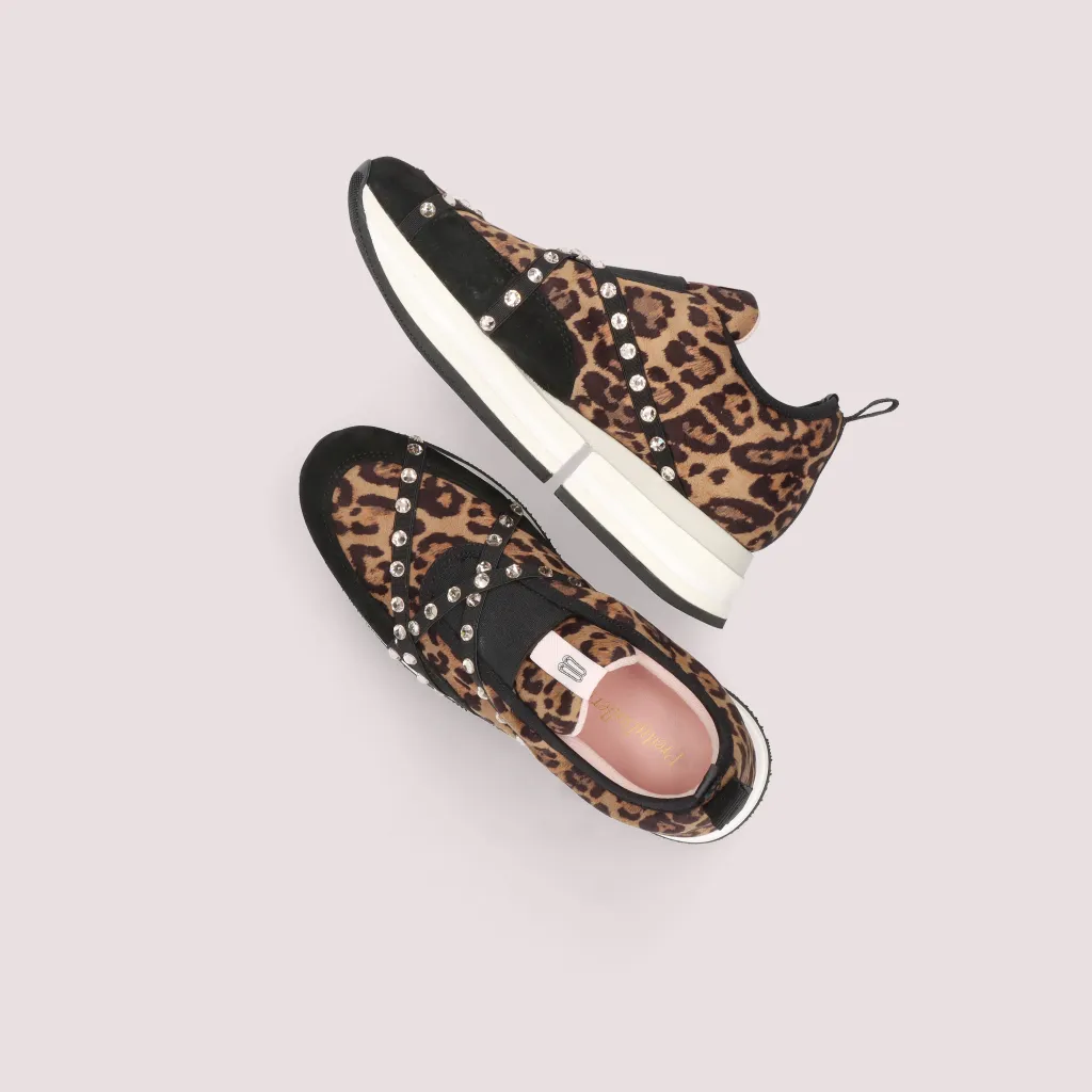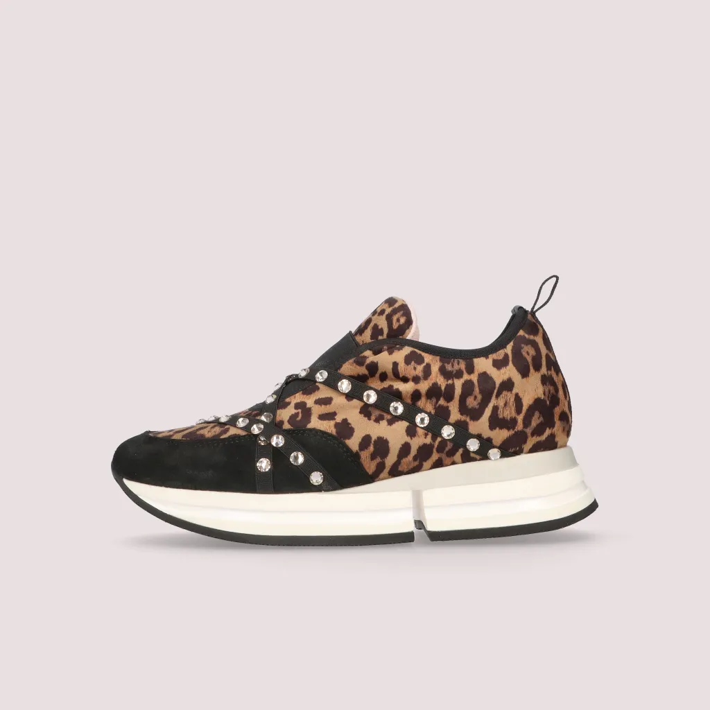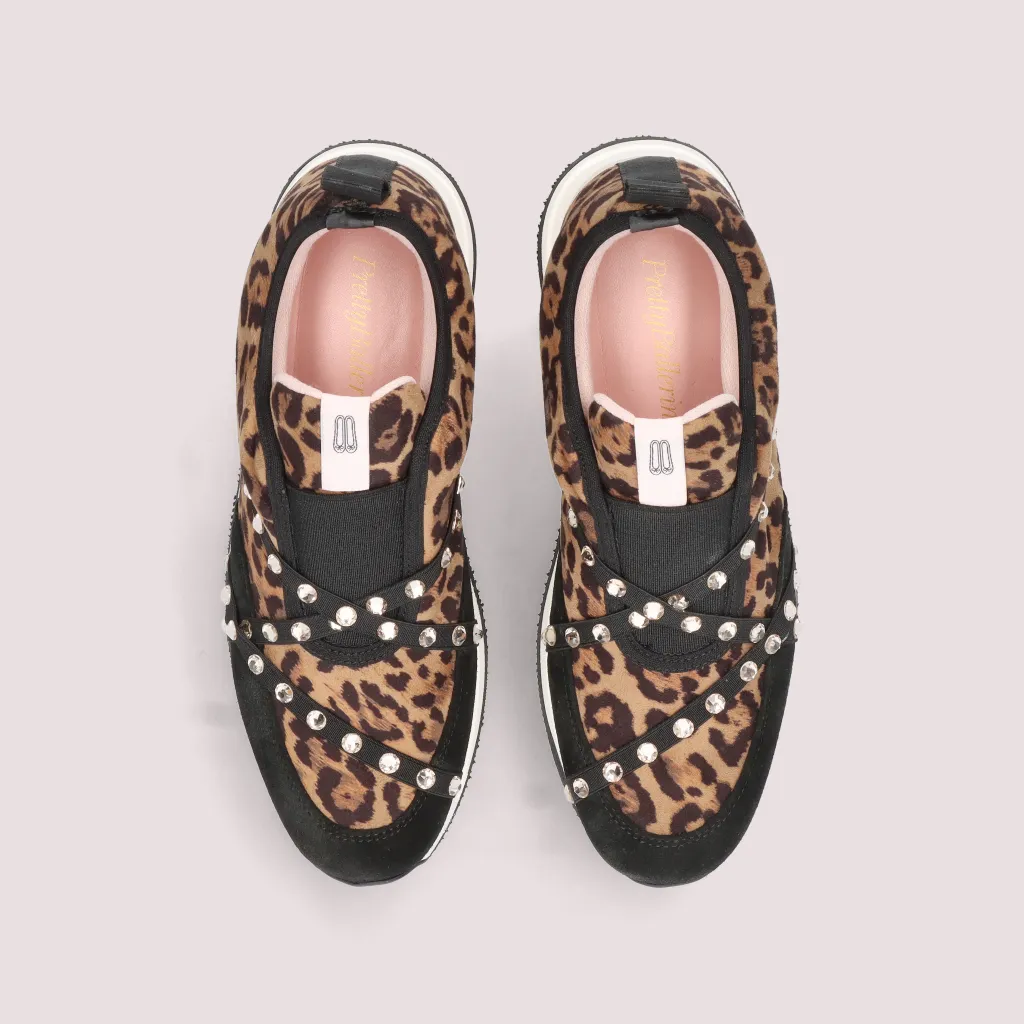סניקרס מטקסטיל בהדפס מנומר וחרטום זמש שחור וכן רצועות של אבני סברובסקי על גומי שחור