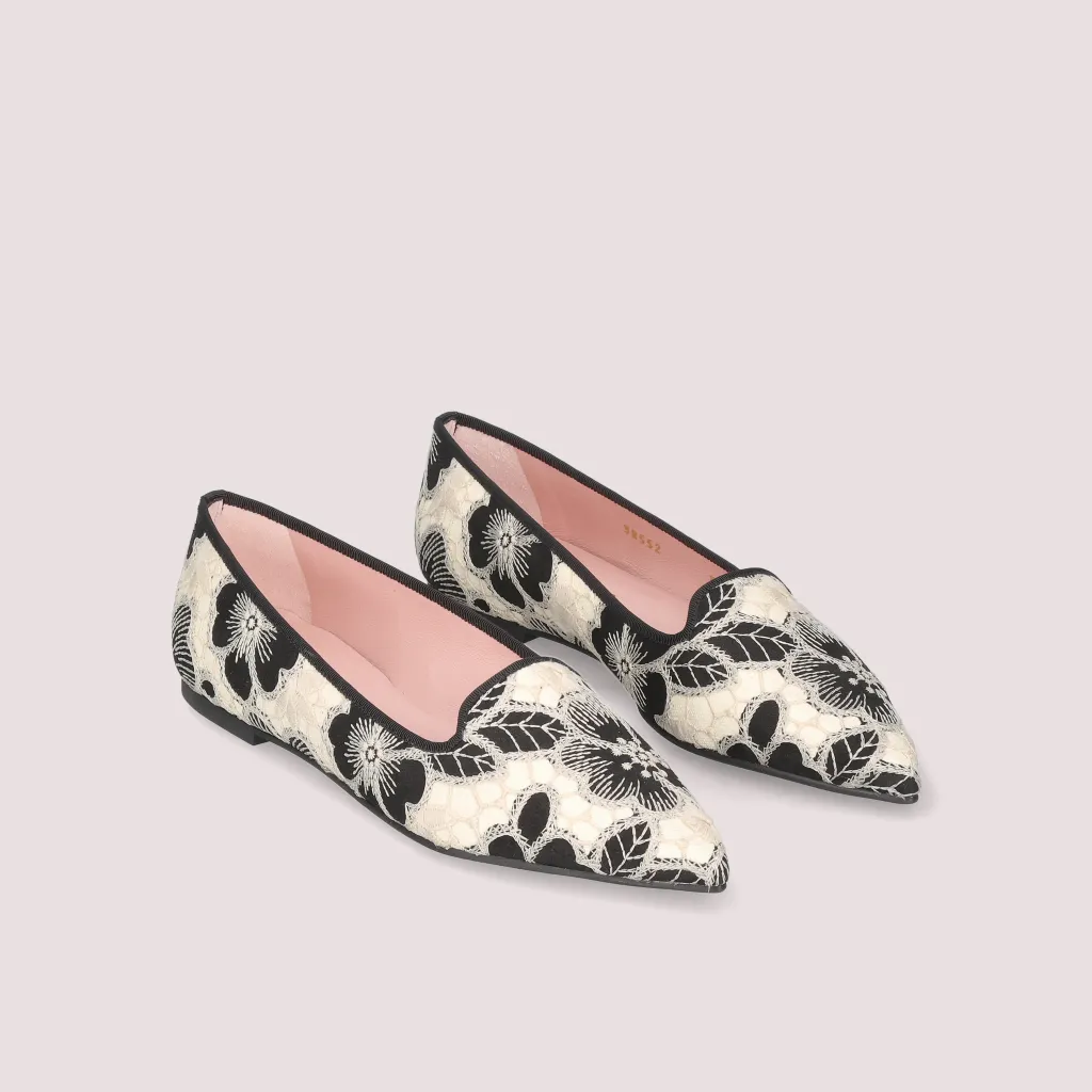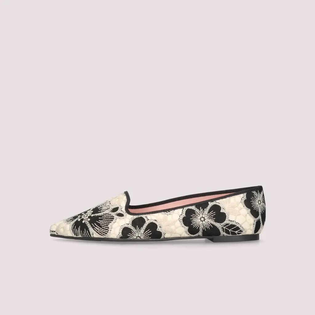 נעלי לאופרס מטקסטיל המשלב פרחים רקומים בשחור ואבן סרט שחור וחרטום שפיץ. בדגם זה מומלץ להזמין חצי מידה יותר מהרגיל