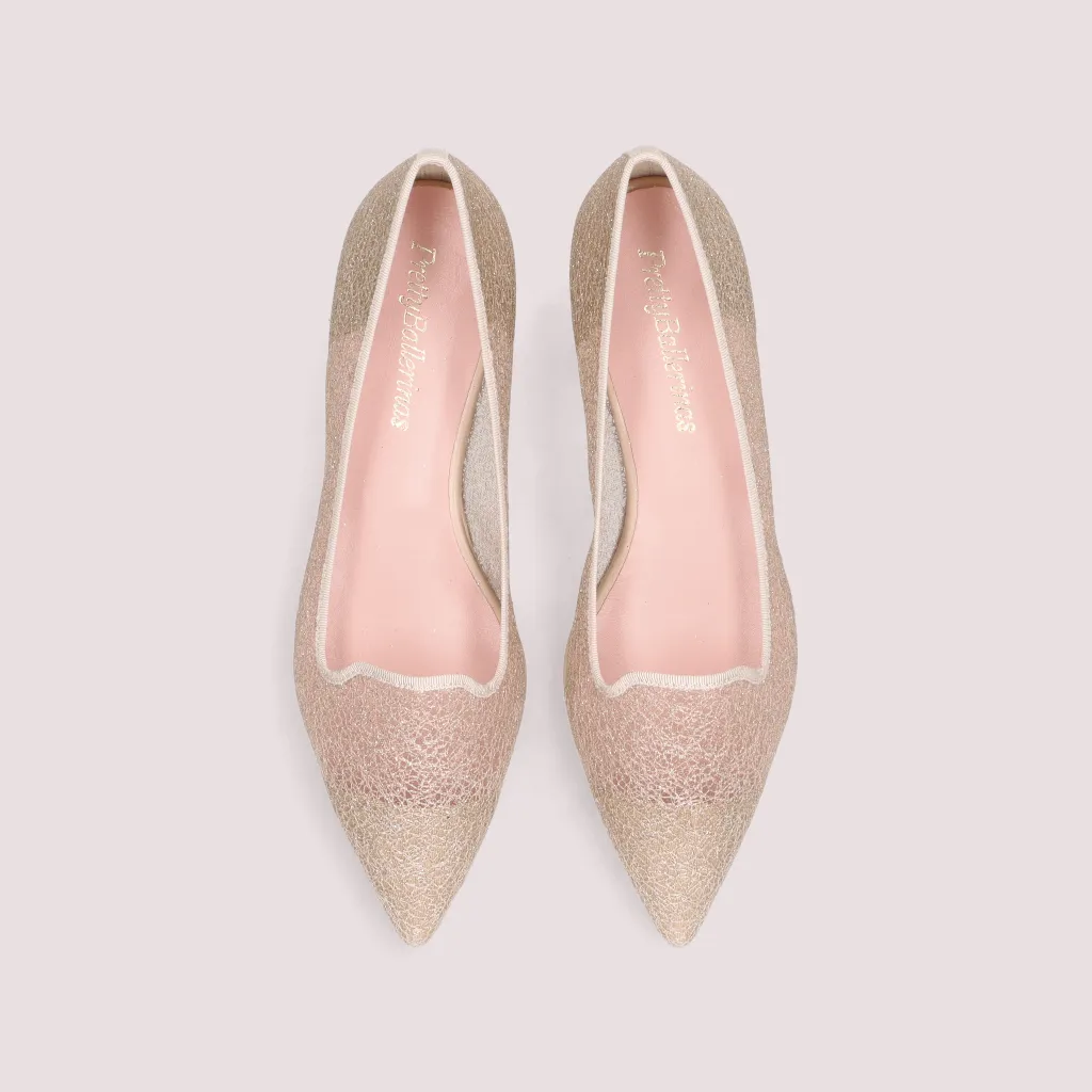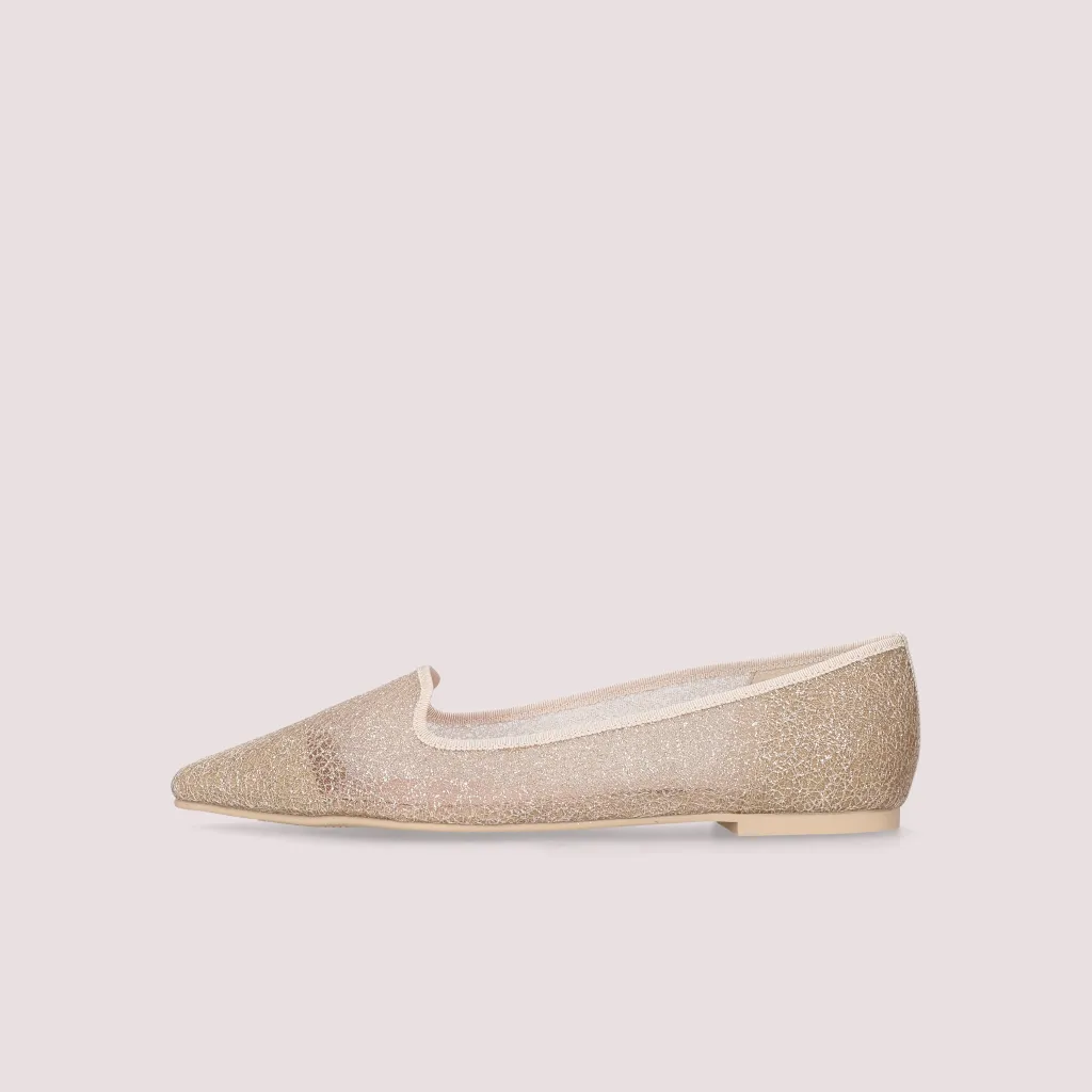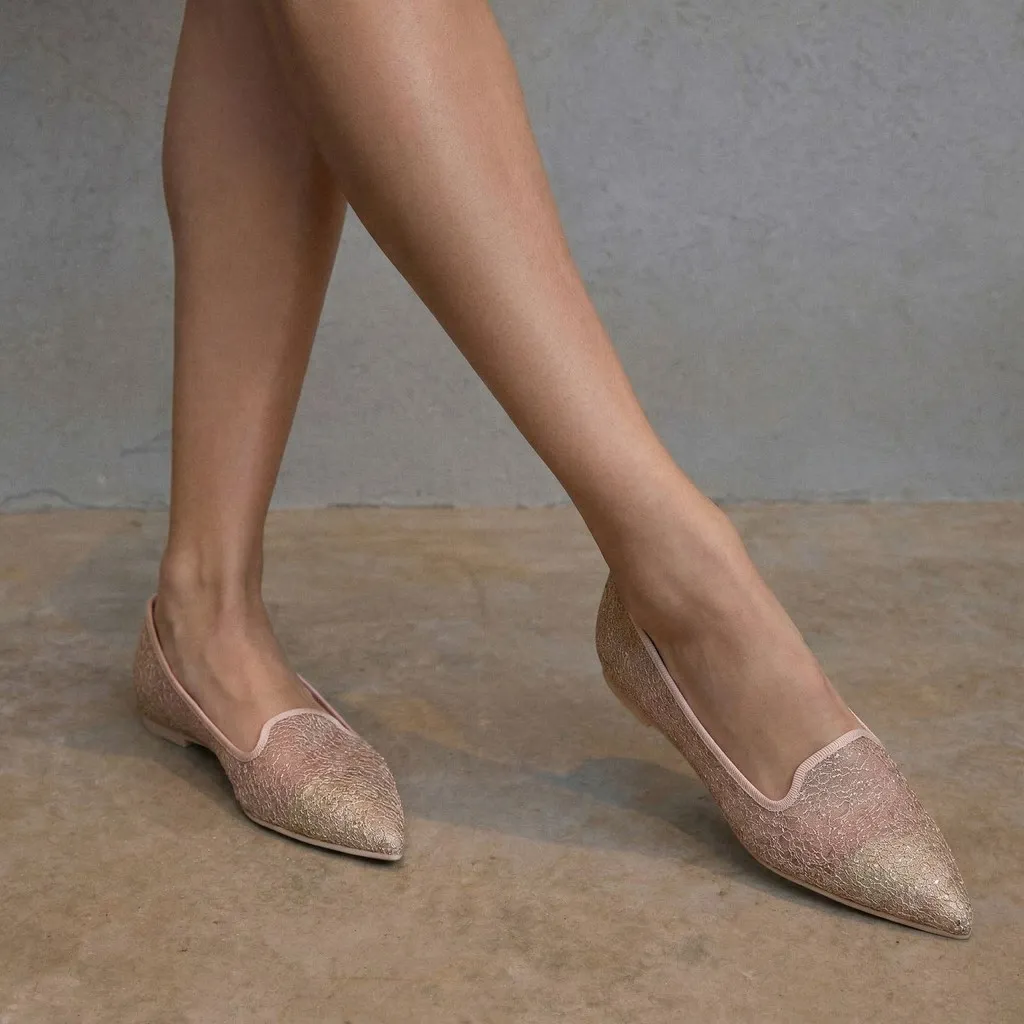 נעלי לאופרס מרשת חוטי זהב בניצנוץ קל, עם סרט תואם וחרטום שפיץ לנשים שמחפשות נעלי בובה עדינות עם מראה נסיכותי