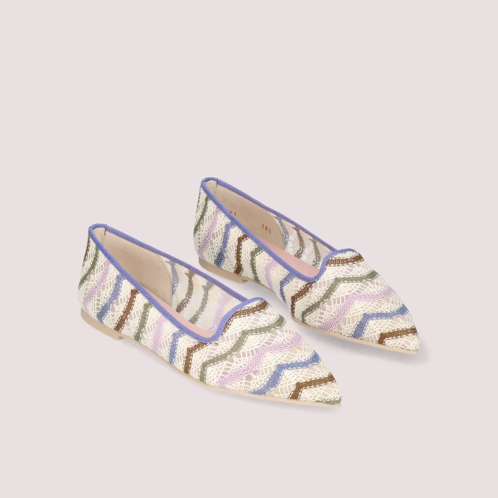 נעלי לאופרס מטקסטיל תחרה בפסים ורוד כחול אפור חום. עם סרט כחול וחרטום שפיץ. בדגם זה מומלץ להזמין חצי מידה יותר מהרגיל