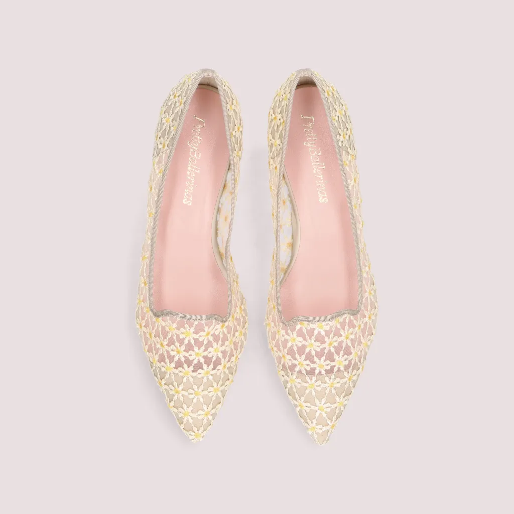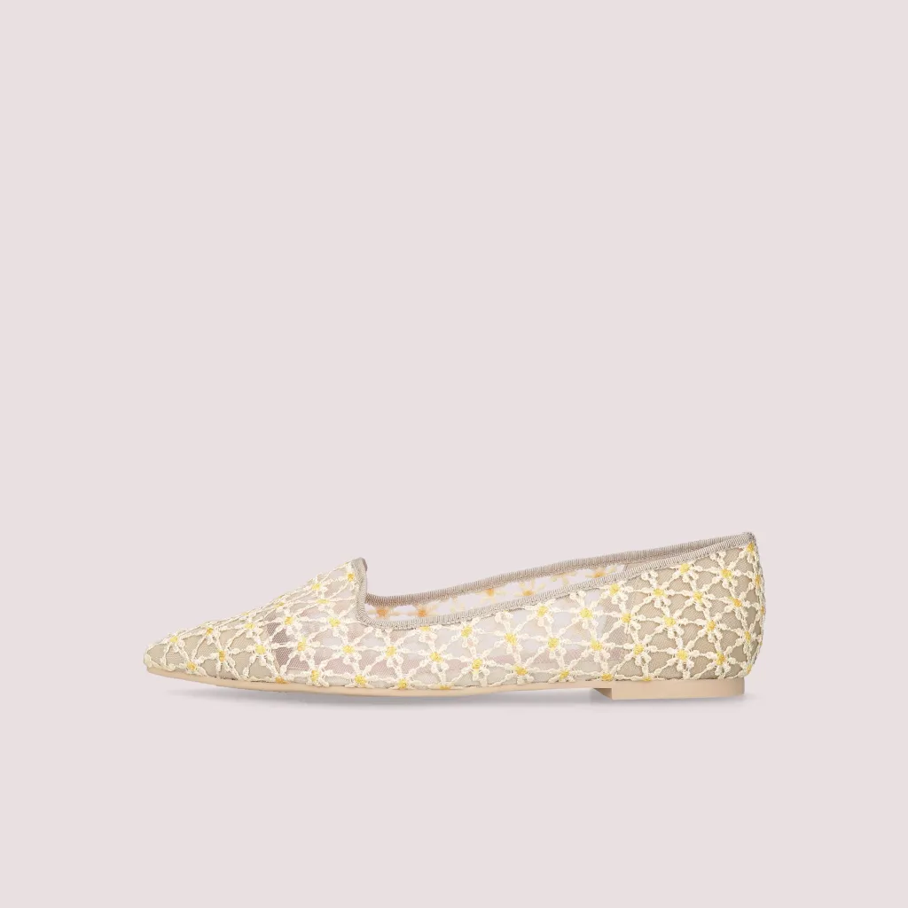 נעלי לאופרס מטקסטיל עשיר ברקמת פרח הדייזי בצבע לבן וצהוב. עם חרטום שפיץ וסרט תואם. בדגם זה מומלץ להזמין חצי מידה יותר מהרגיל