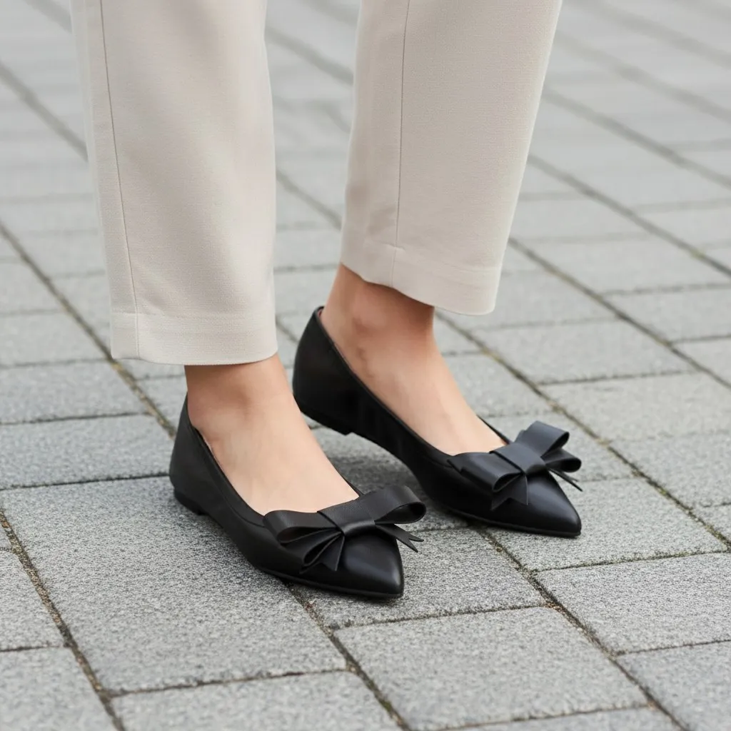 נעלי השירלי שלנו מעור מט שחור עם פפיון שחור וחרטום שפיץ ישדרגו את ההופעה שלך עם נגיעה יוקרתית ותחושת נשיות מובהקת