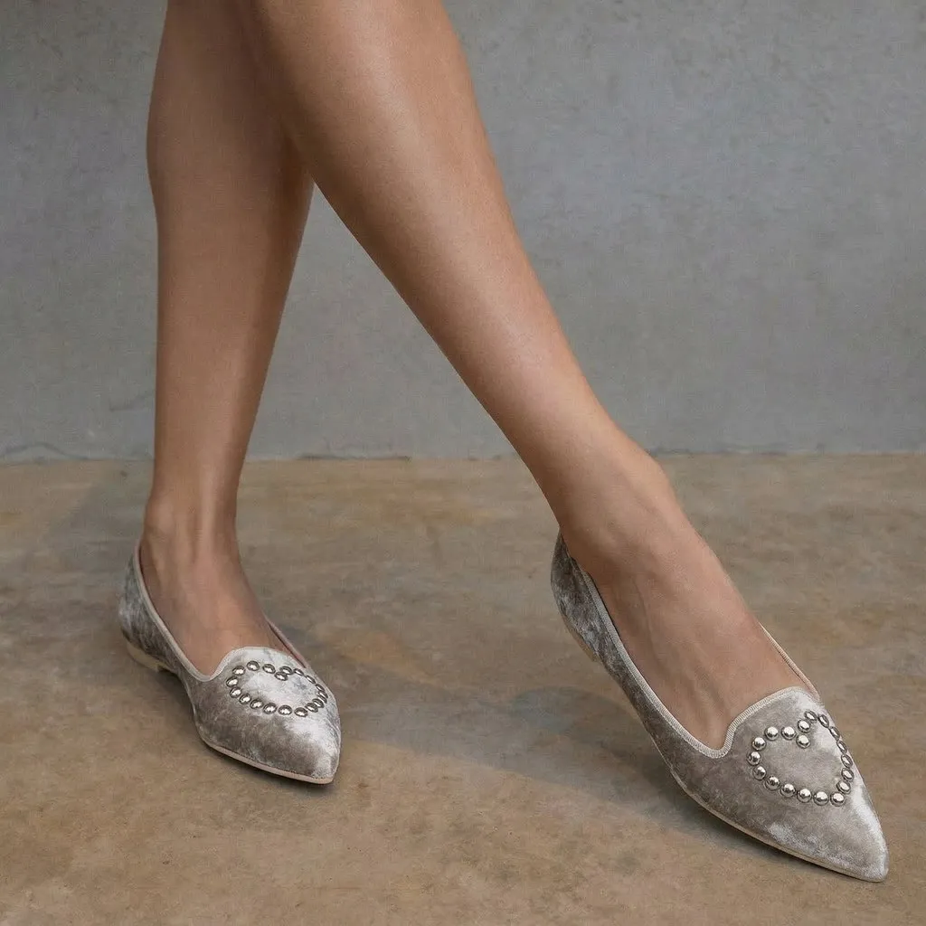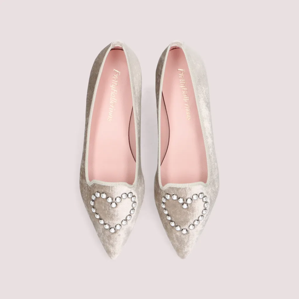 נעלי לאופרס מבד קטיפה בצבע פנינה, משובצות בלב מאבני סברובסקי לבנות, עם סרט תואם לנעל וחרטום שפיץ לנשים שמחפשות נעליים שמשדרות יוקרה ונשיות
