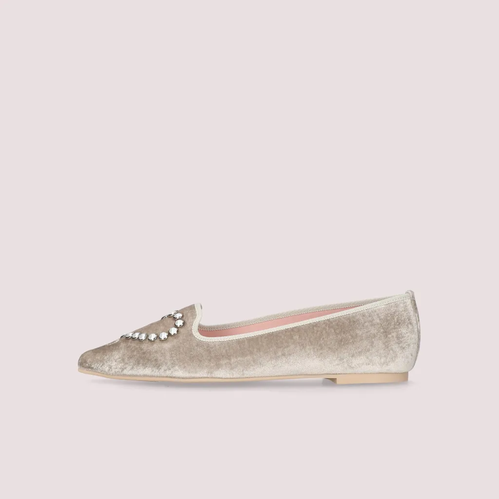 נעלי לאופרס מבד קטיפה בצבע פנינה משובץ בלב באבני סברובסקי לבנות. עם סרט תואם לנעל וחרטום שפיץ. בדגם זה מומלץ להזמין חצי מידה יותר מהרגיל