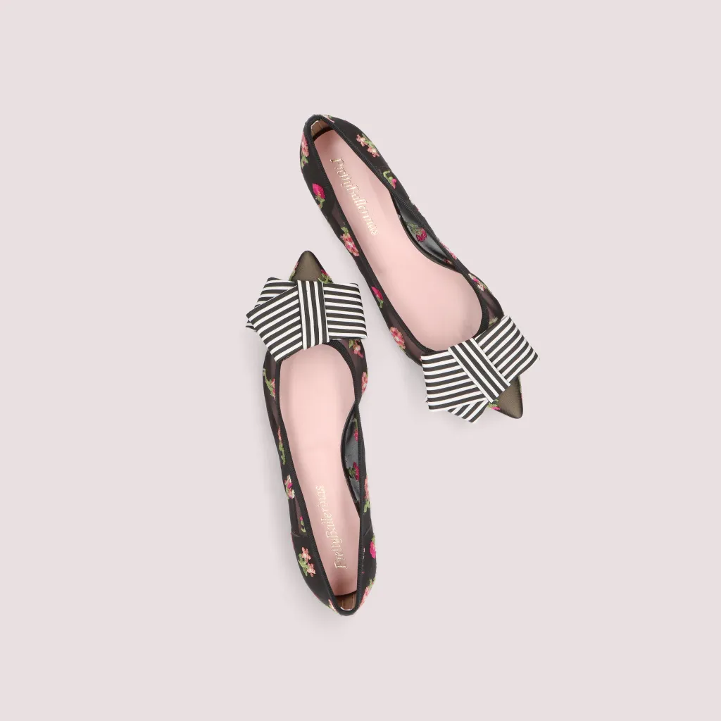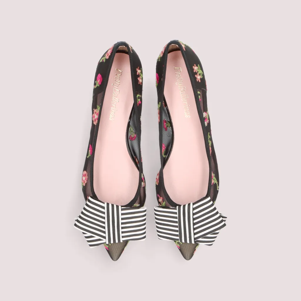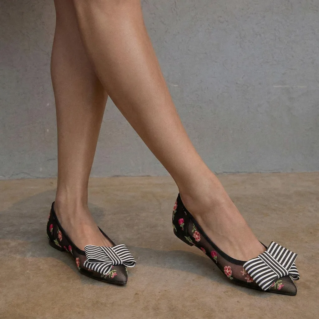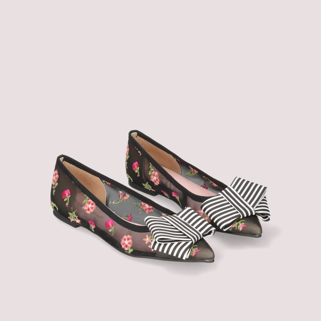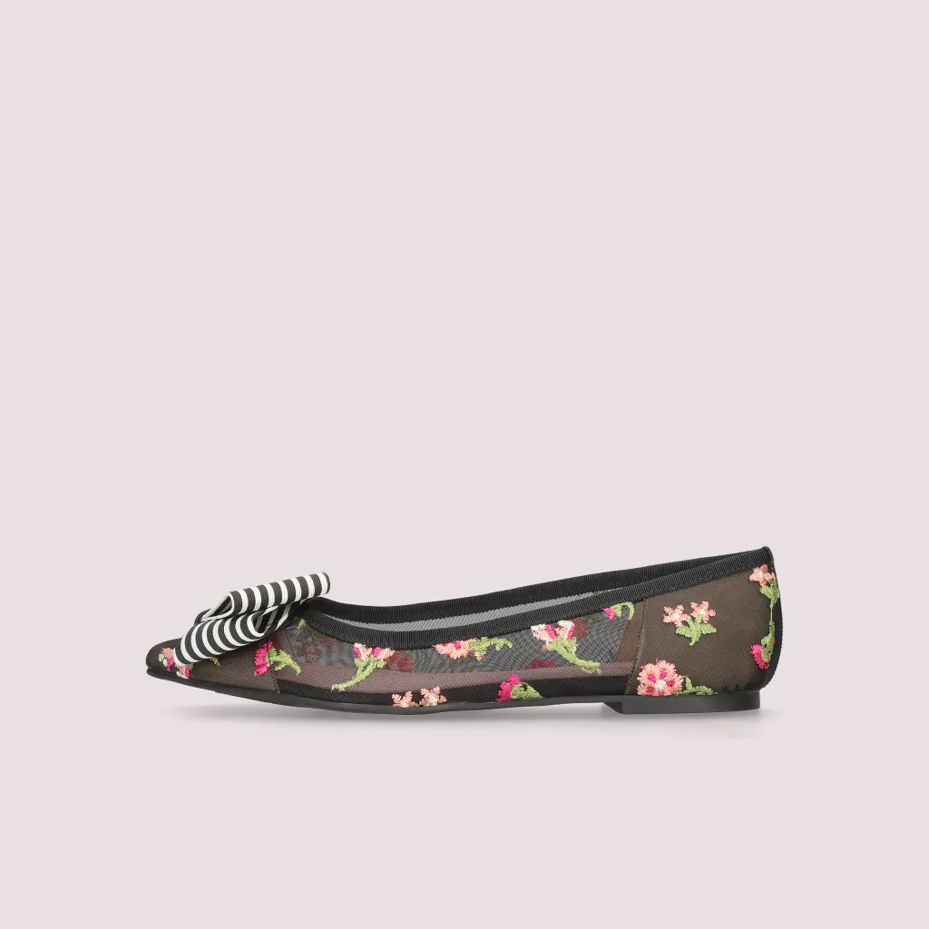 נעלי בלרינה מרשת שחורה מעוטרת בפרחים רקומים בצבעי אדום ורוד לבן וירוק. עם חרטום שפיץ פפיון פסים שחור לבן וסרט שחור. בדגם זה מומלץ להזמין חצי מידה יותר מהרגיל