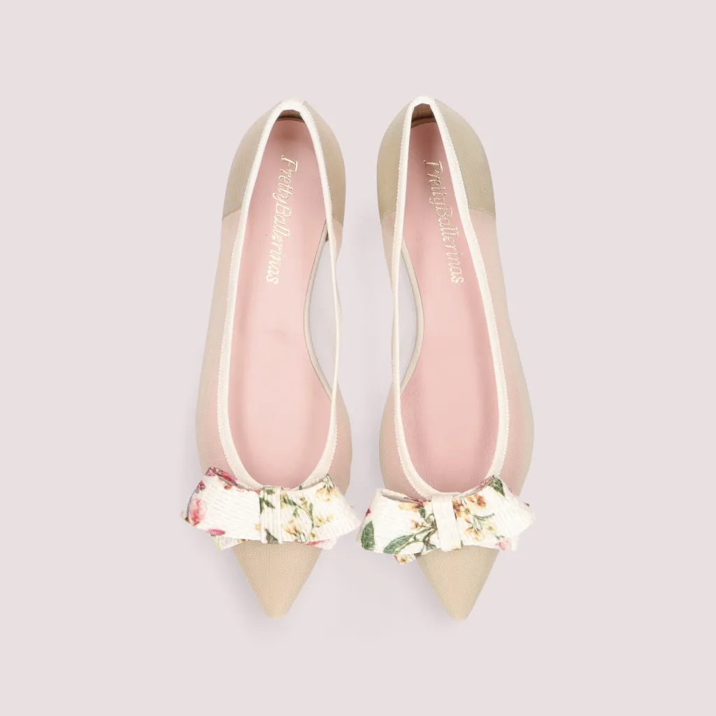 נעלי בלרינה מרשת בצבע אבן מעוטר בפפיון ראפיה בצבע פנינה בהדפס פרחים וחרטום שפיץ. בדגם זה מומלץ להזמין חצי מידה יותר מהרגיל