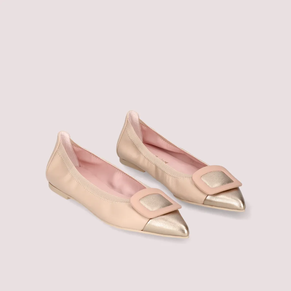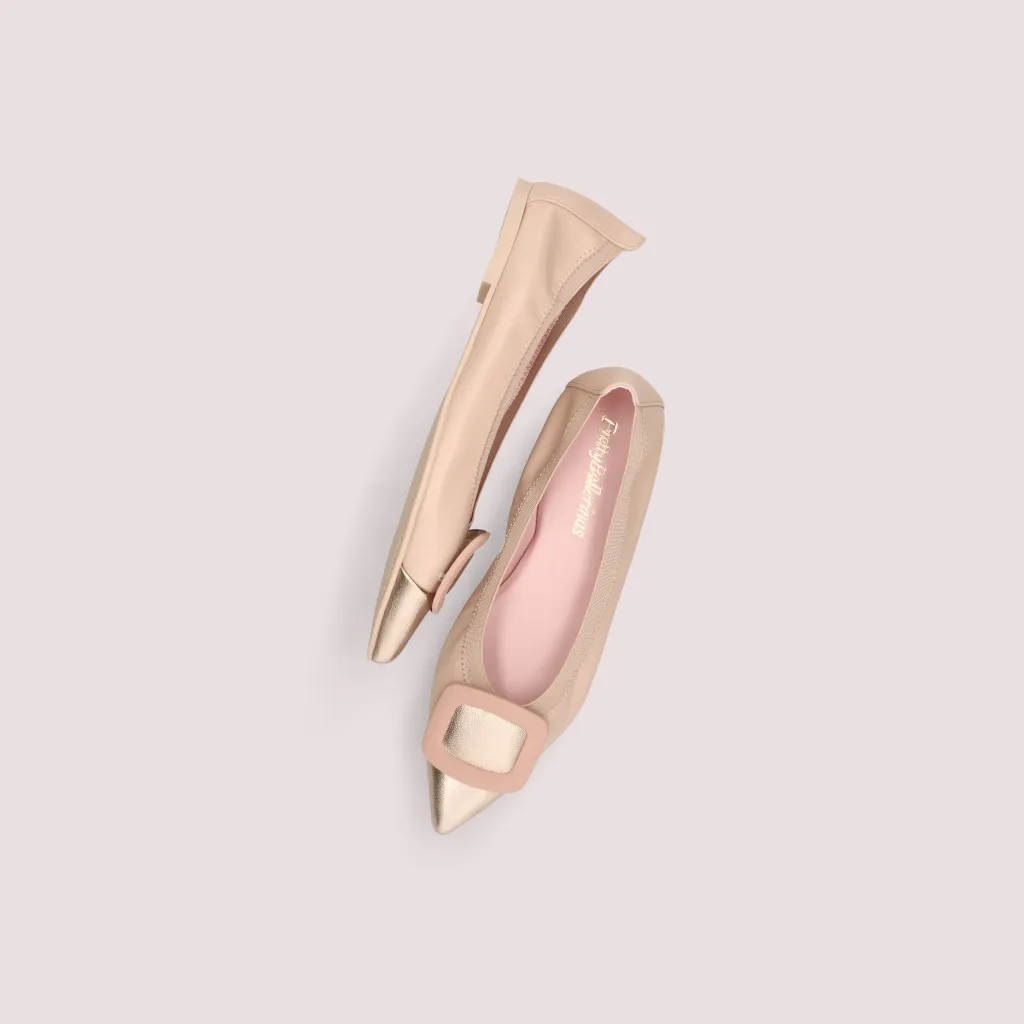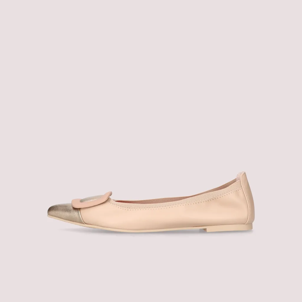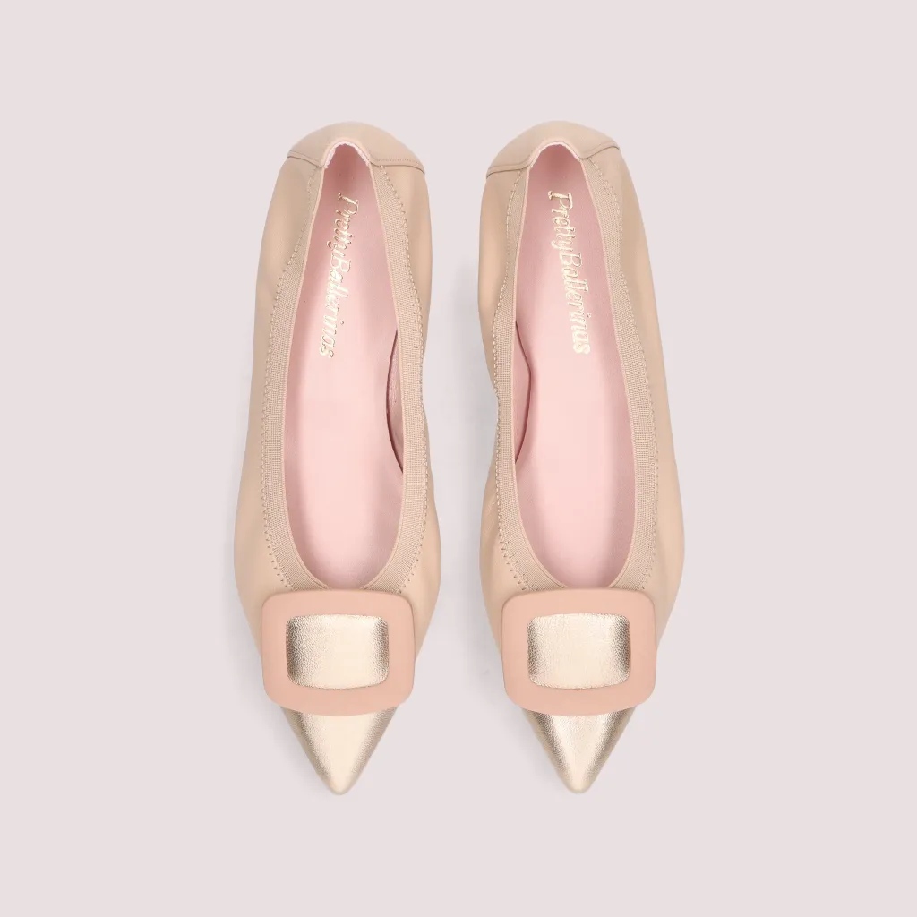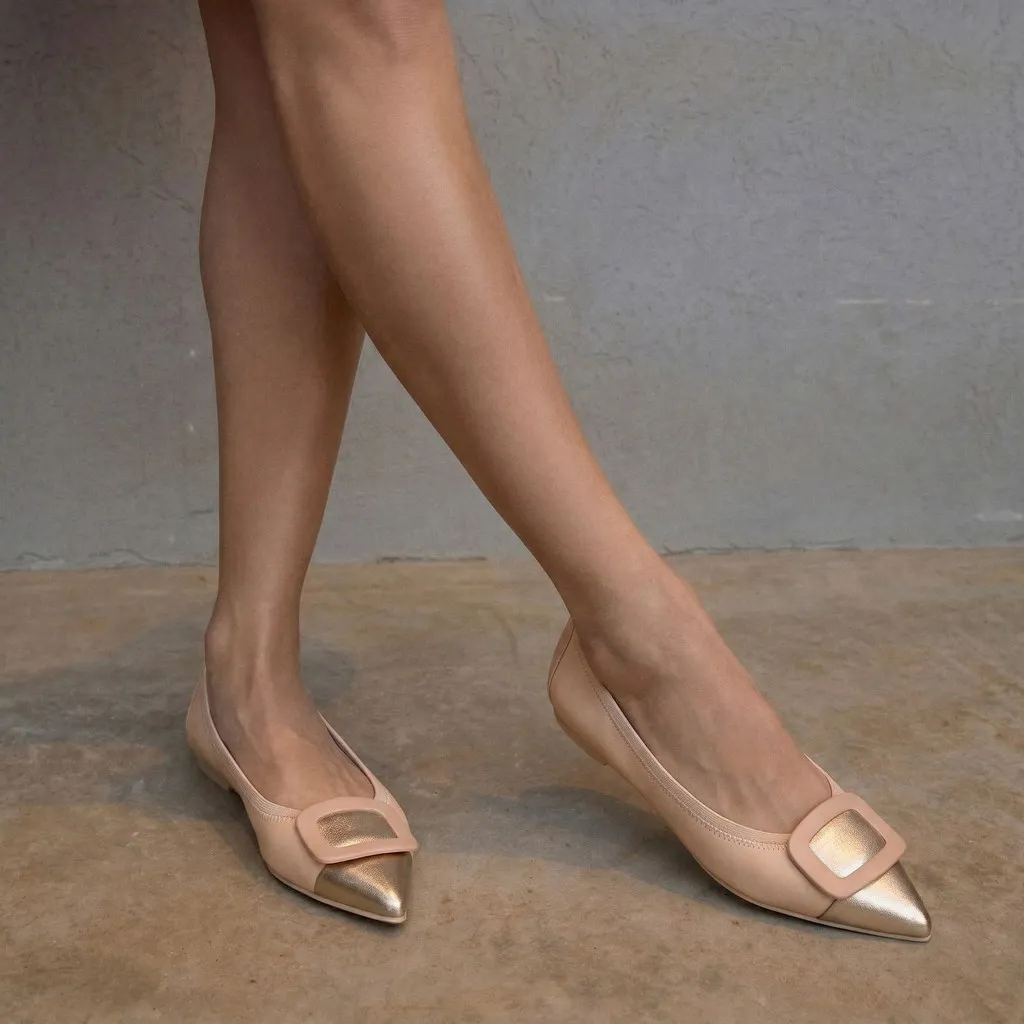 נעלי השירלי שלנו מעור מט בצבע ניוד וחרטום שפיץ עור בצבע זהב מעוטר באבזם ניוד וגומי תואם. בדגם זה מומלץ לקחת מידה יותר