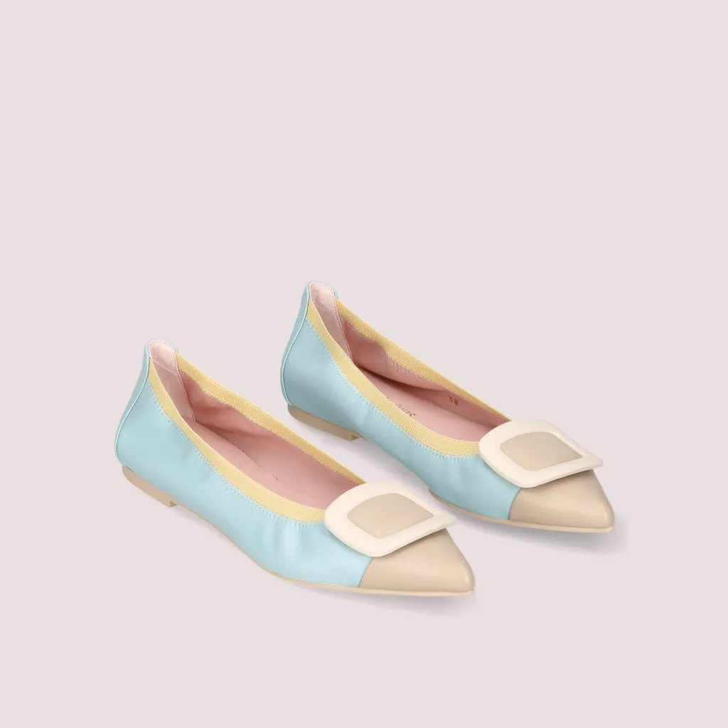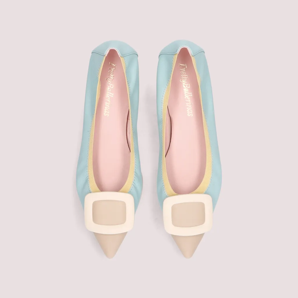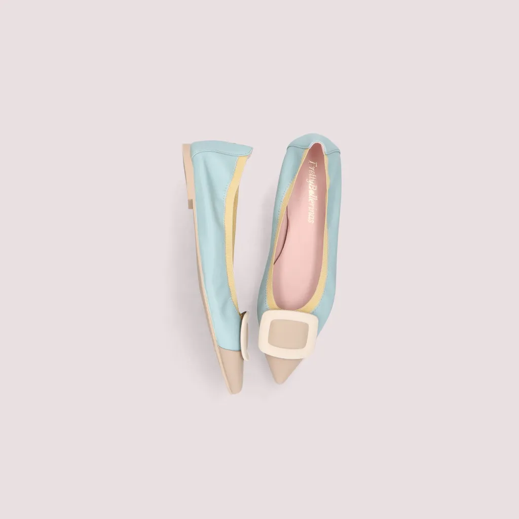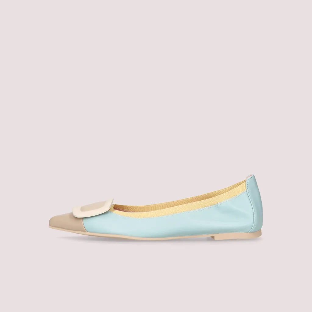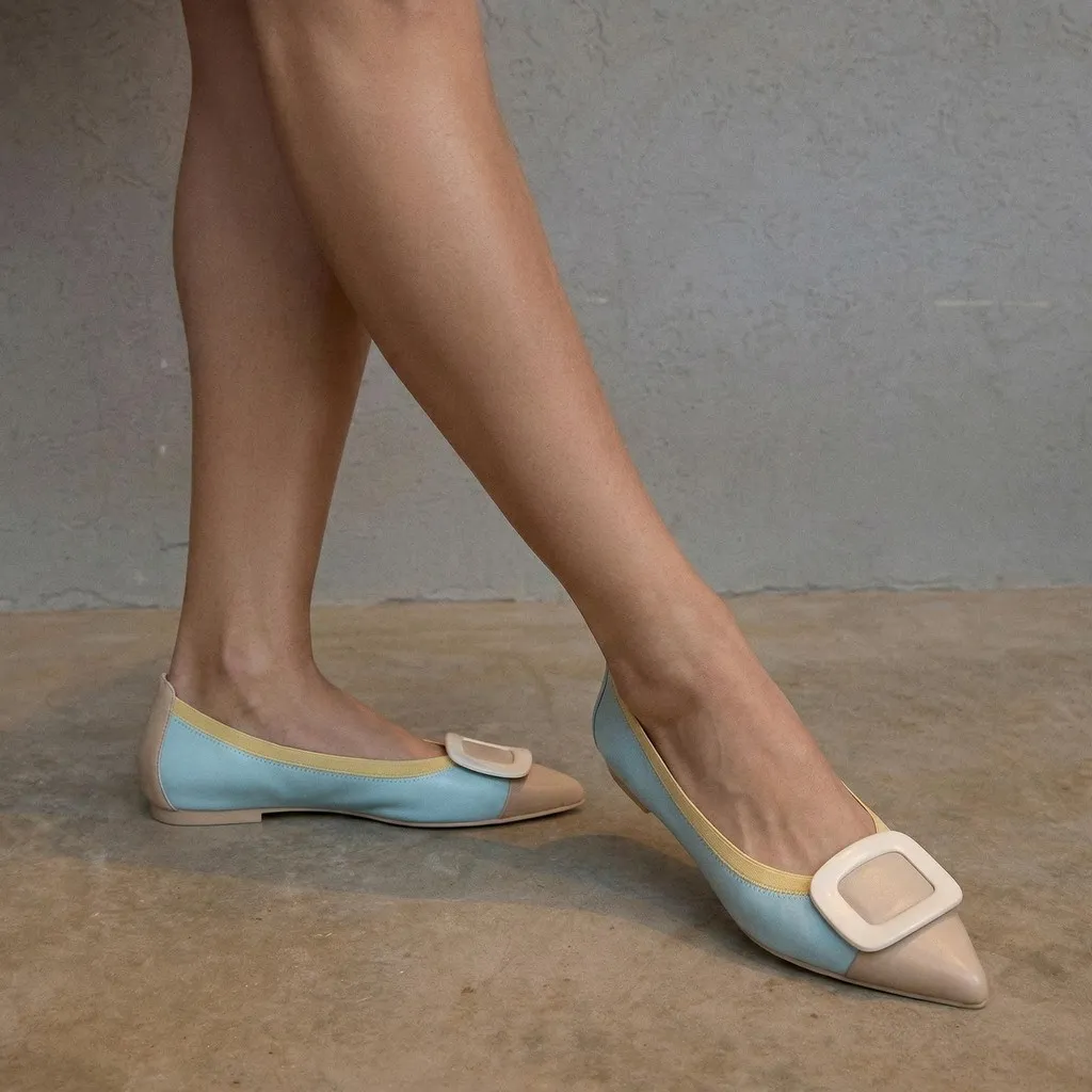 נעלי השירלי שלנו מעור מט בצבע תכלת וחרטום שפיץ מעור בצבע בז’ מעוטר באבזם בצבע שמנת וגומי צהוב. בדגם זה מומלץ לקחת מידה יותר
