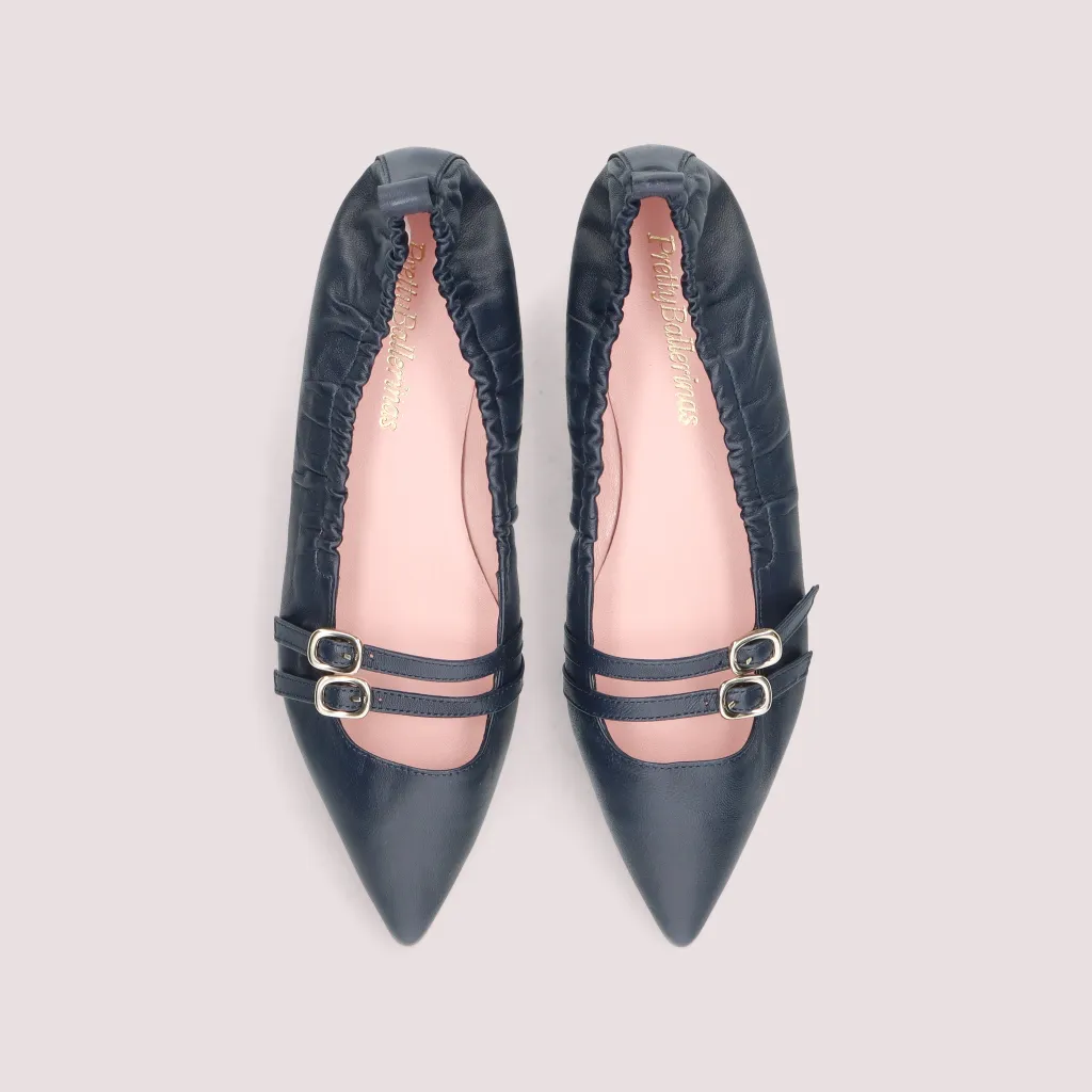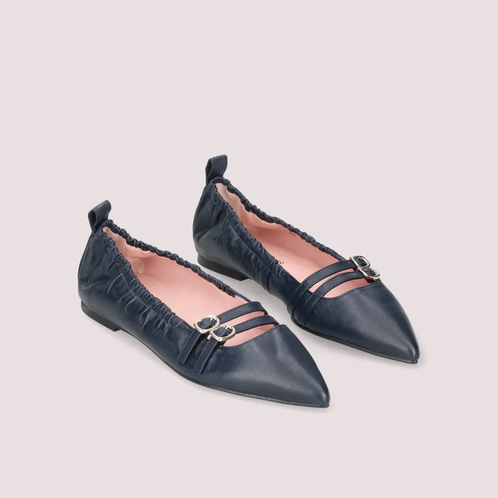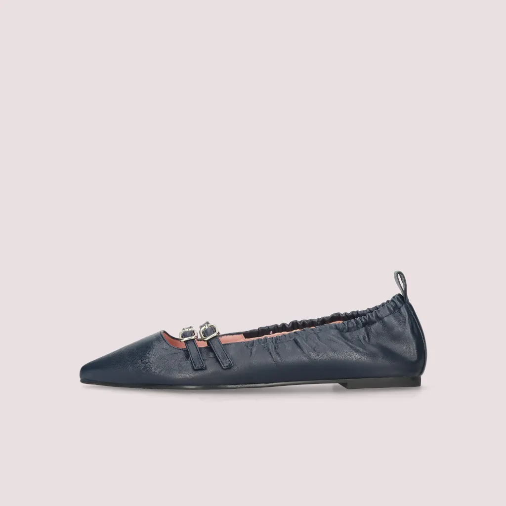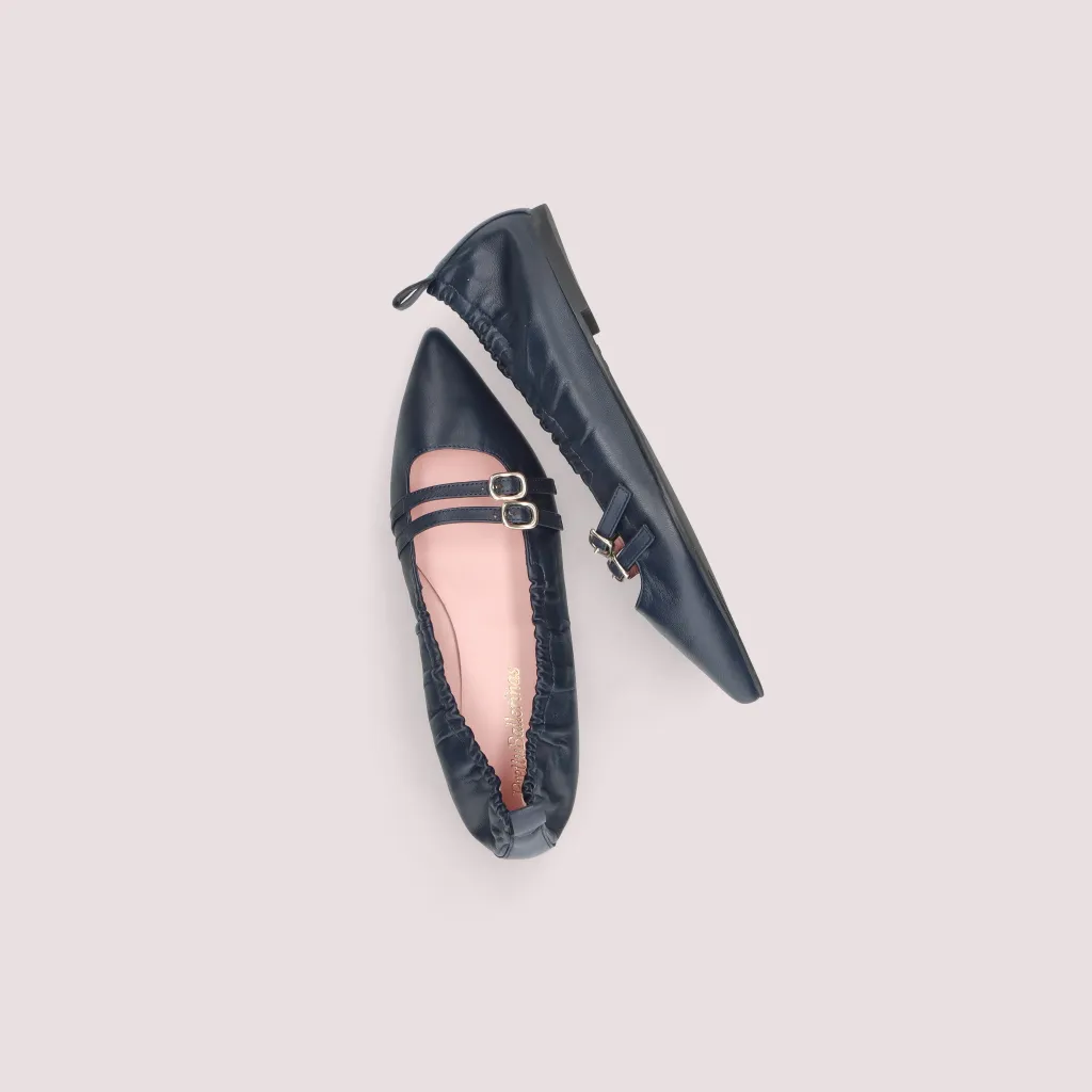 נעלי בלרינה מעור מט בצבע כחול עם 2 רצועות וחרטום שפיץ. בדגם זה מומלץ להזמין חצי מידה יותר מהרגיל