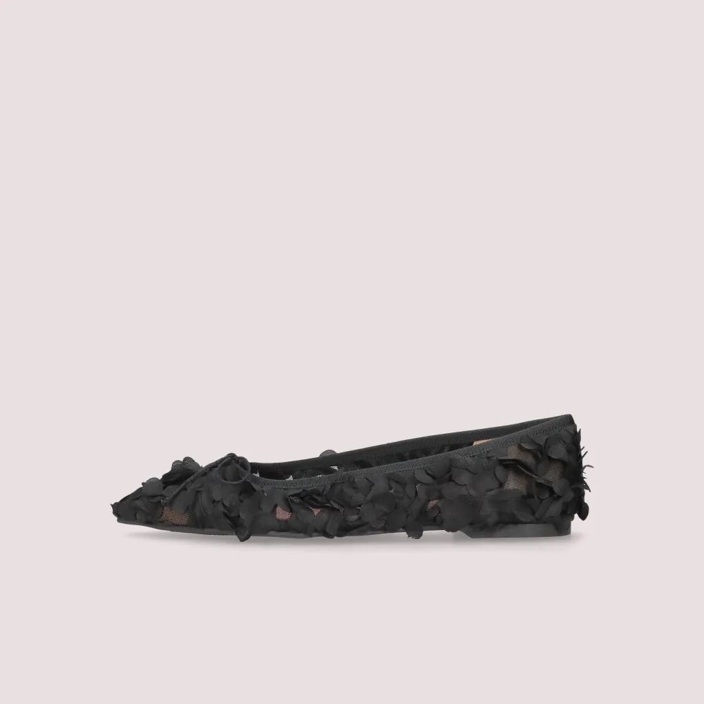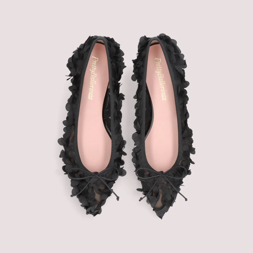 נעלי בלרינה מטקסטיל של פרחים תלת מימדיים בשחור וחרטום שפיץ. בדגם זה מומלץ להזמין חצי מידה יותר מהרגיל