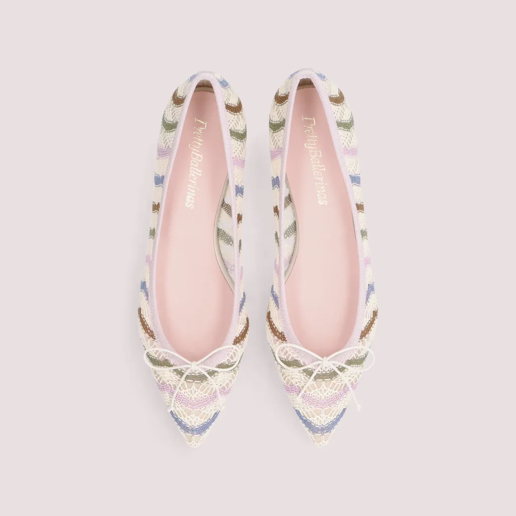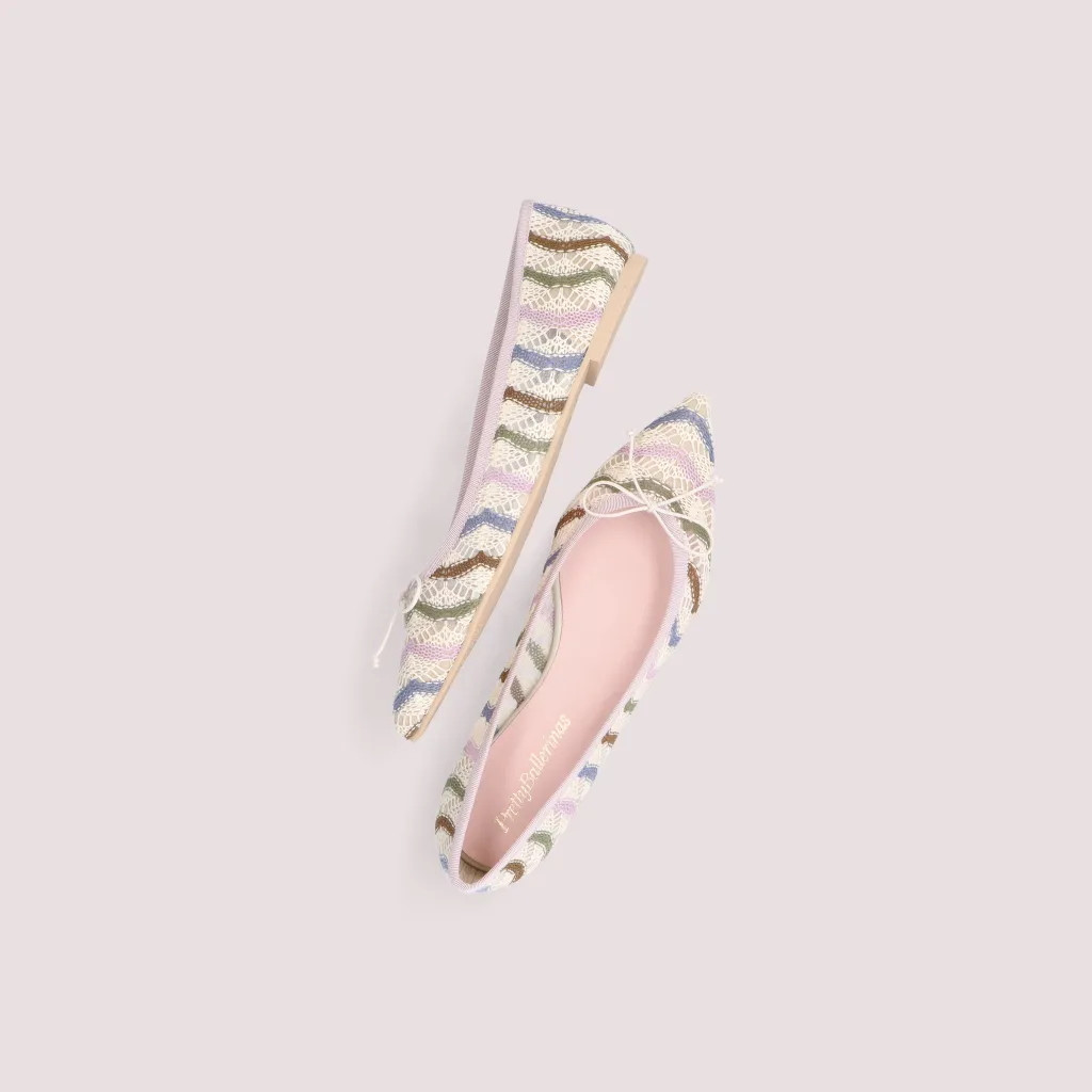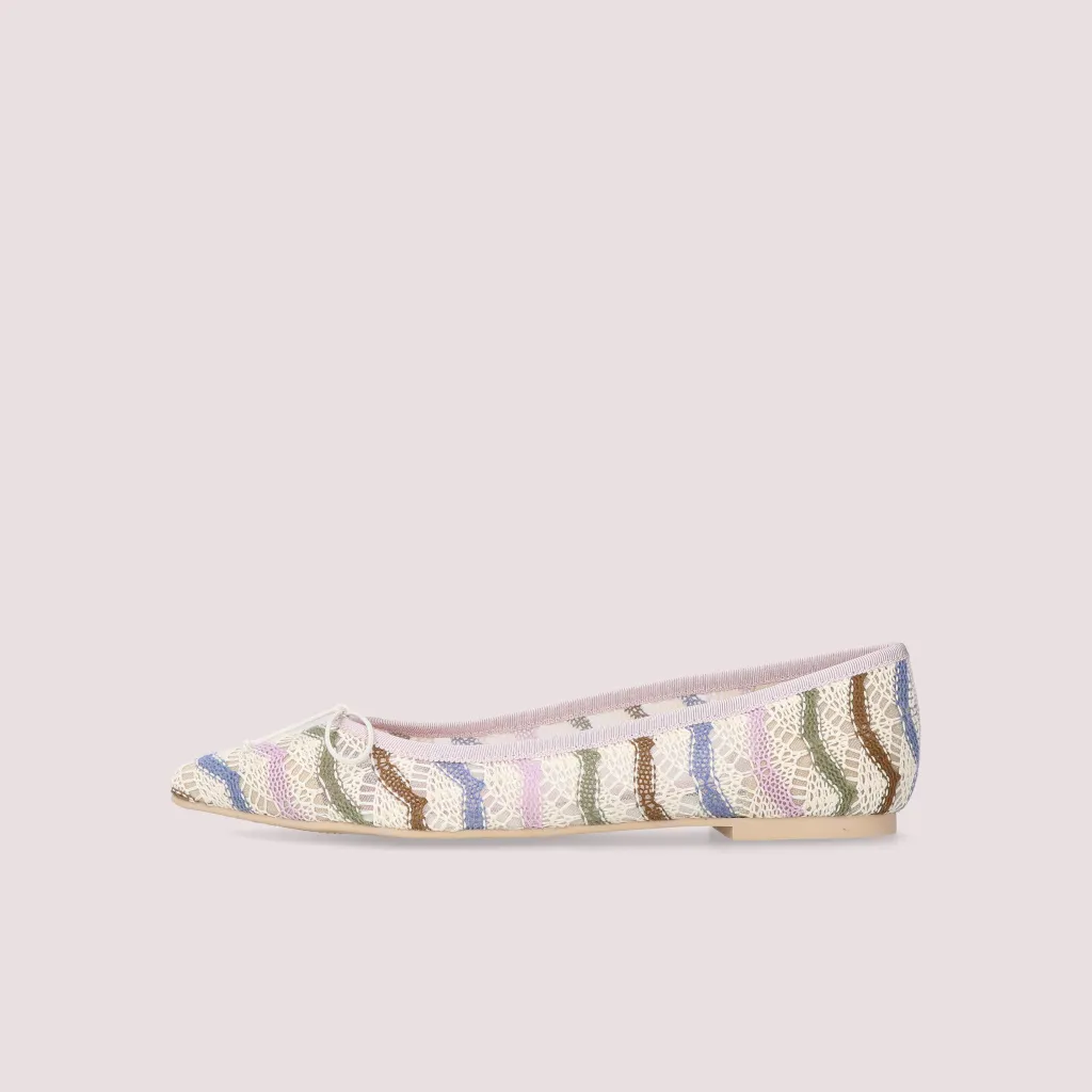 נעלי בלרינה מטקסטיל תחרה בפסים ורוד כחול אפור חום ופפיון שמנת. עם סרט סגול וחרטום שפיץ. בדגם זה מומלץ להזמין חצי מידה יותר מהרגיל