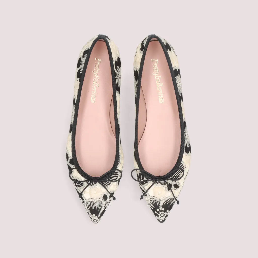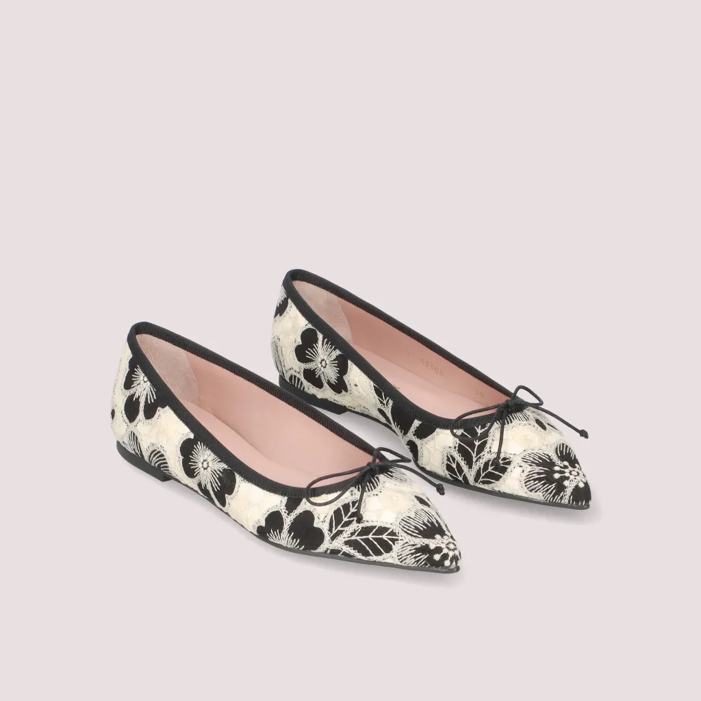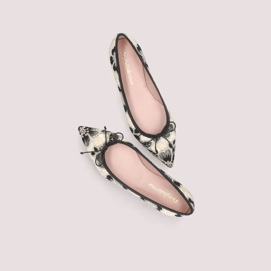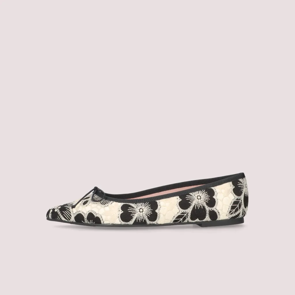 נעלי בלרינה מטקסטיל המשלב פרחים רקומים בשחור ואבן סרט שחור וחרטום שפיץ. בדגם זה מומלץ להזמין חצי מידה יותר מהרגיל