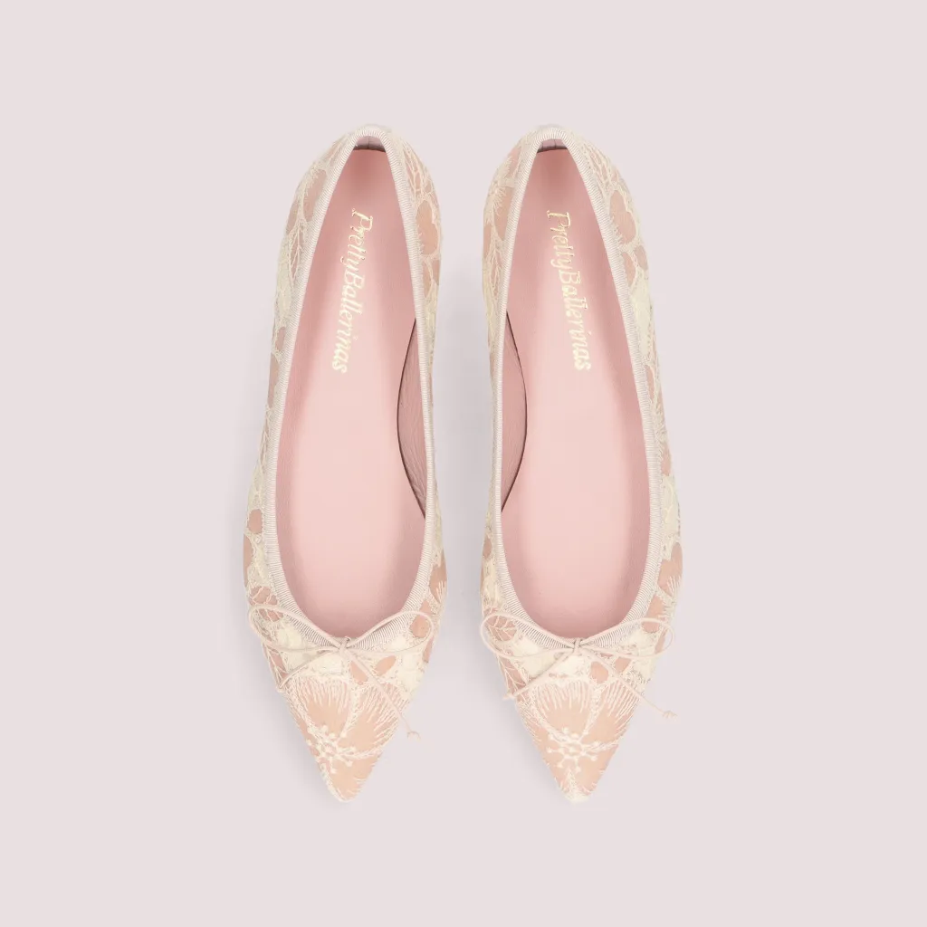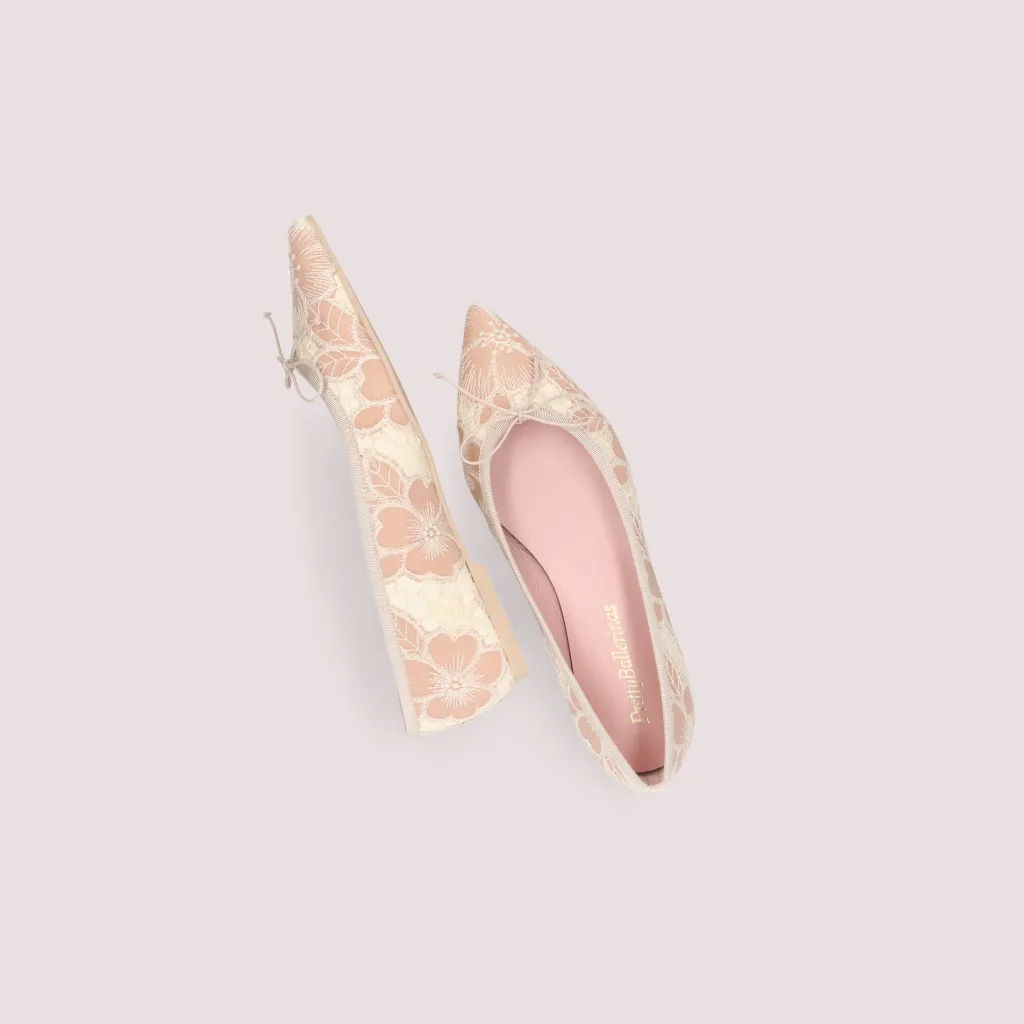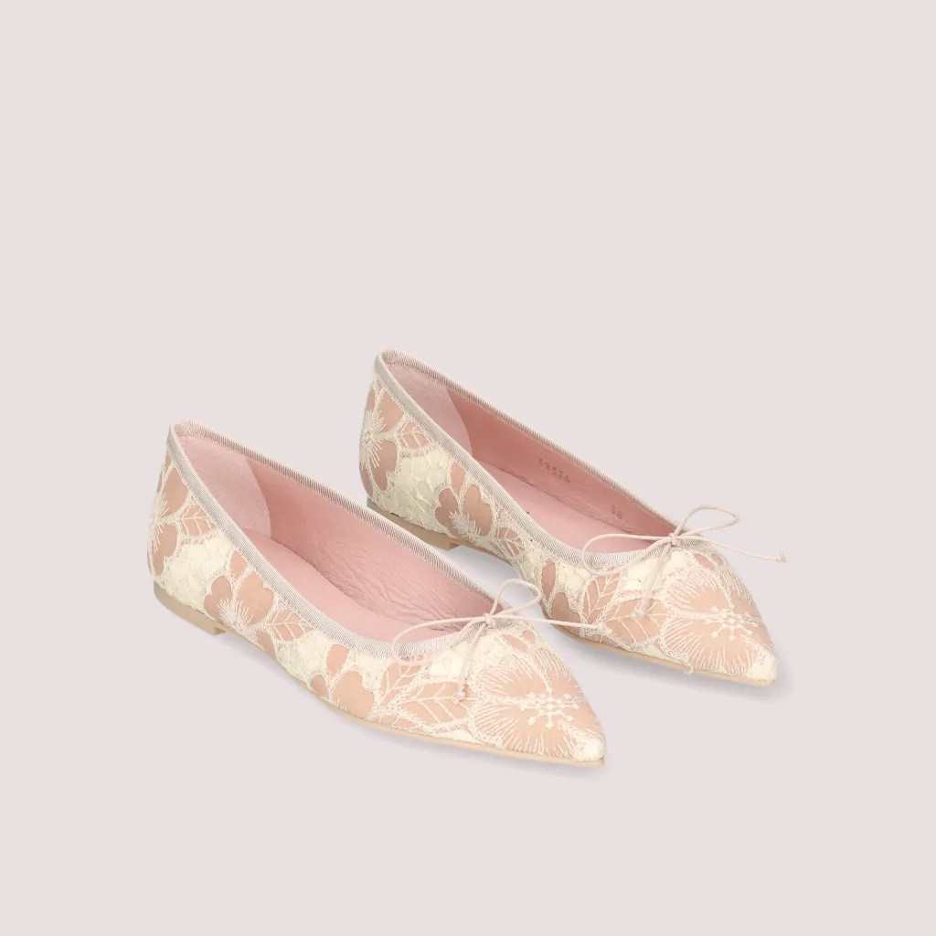נעלי בלרינה מטקסטיל המשלב פרחים רקומים בורוד ואבן סרט אבן וחרטום שפיץ. בדגם זה מומלץ להזמין חצי מידה יותר מהרגיל