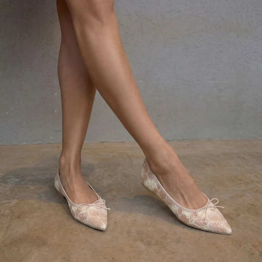 נעלי בלרינה מטקסטיל המשלב פרחים רקומים בוורוד ואבן, עם סרט אבן וחרטום שפיץ מתאימות לנשים שמחפשות נעליים רומנטיות ונשיות