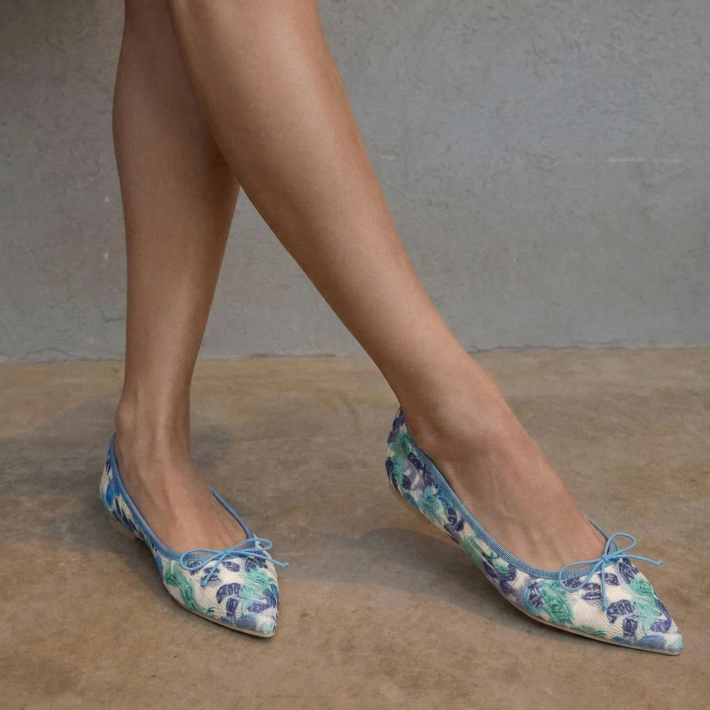 נעלי בלרינה מטקסטיל רקום של עלים ופרחים בגוונים כחולים עם סרט ופפיון תואמים וחרטום שפיץ יתאימו לנשים שלא מפחדות להכניס צבעים ללוקים שלהן
