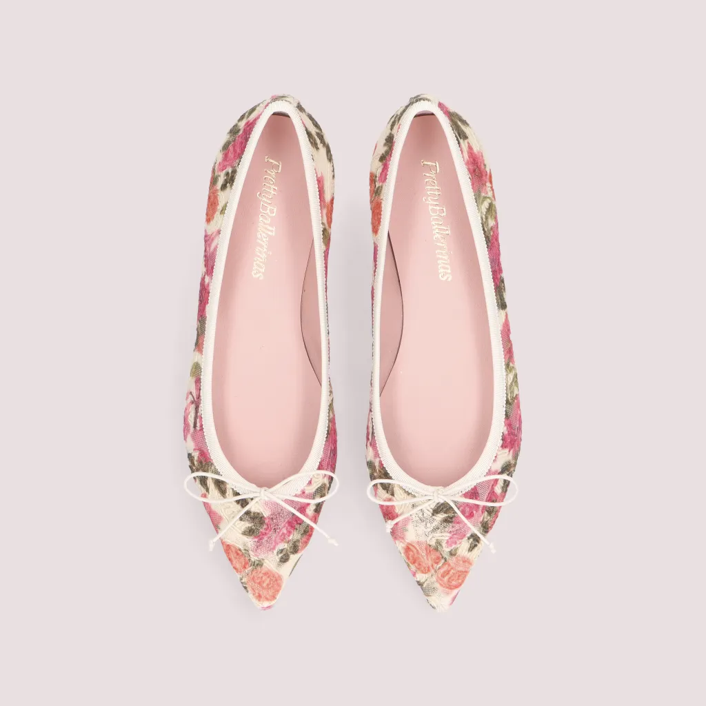נעלי בלרינה מטקסטיל רקום של עלים ופרחים בגוונים ירוקים כתומים וורודים. עם חרטום שפיץ וסרט ושרוך תואמים. בדגם זה מומלץ להזמין חצי מידה יותר מהרגיל