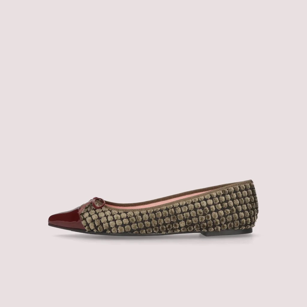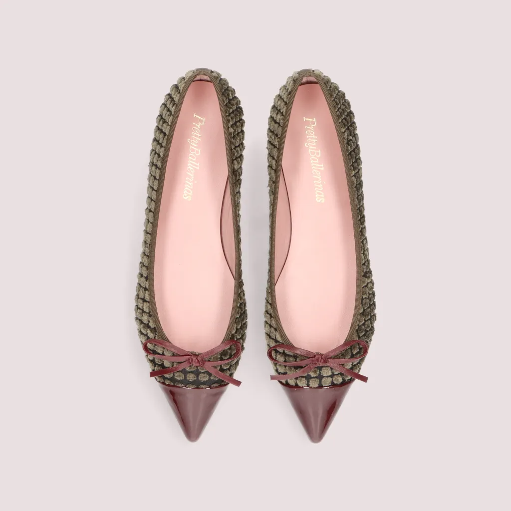 נעלי בלרינה מטקסטיל שחור ועליו עיגולי פרווה בצבע זית. עם חרטום שפיץ בלק בורדו וכן סרט חאקי ושרוך בורדו. בדגם זה מומלץ להזמין חצי מידה יותר מהרגיל