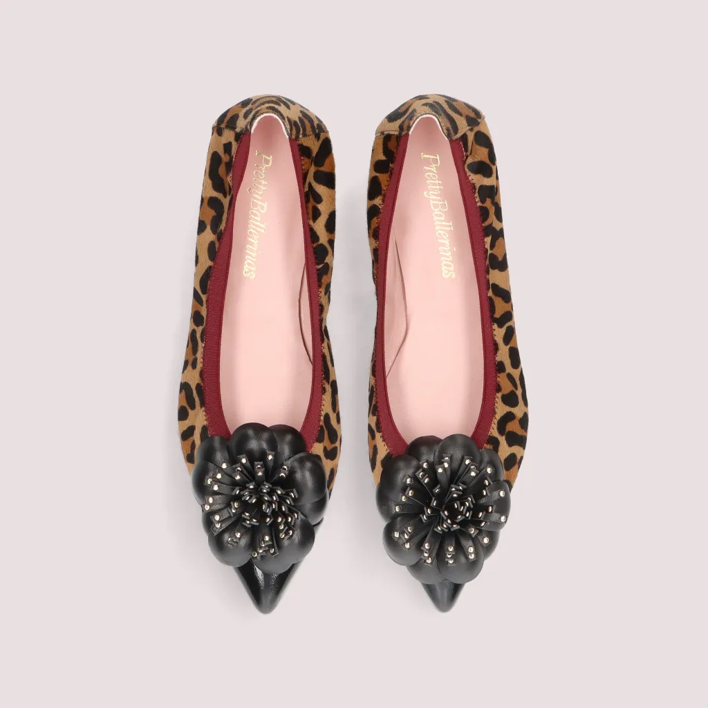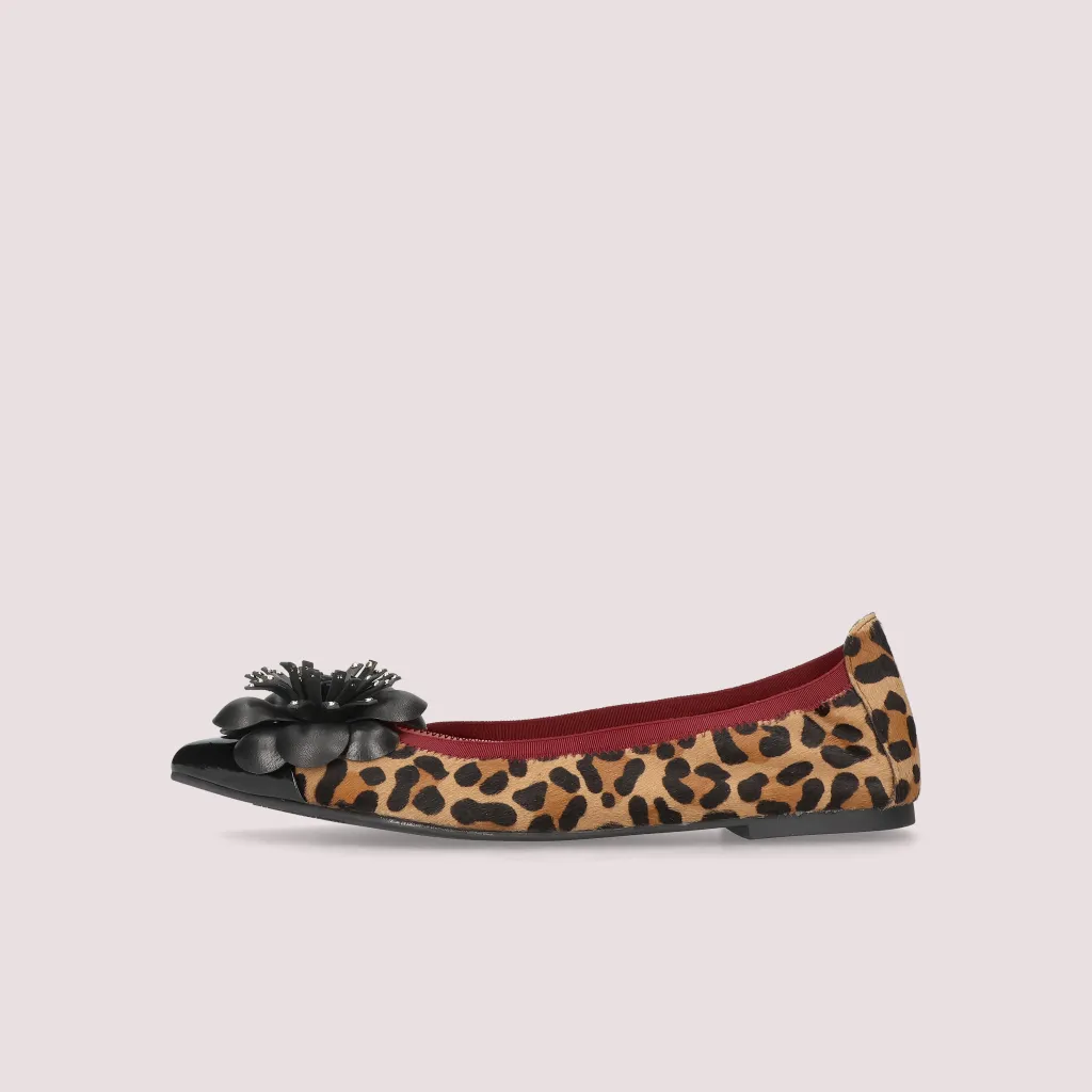 נעלי השירלי שלנו מפרווה בהדפס מנומר וחרטום שפיץ בלק שחור מעוטר בפרח. בדגם זה מומלץ לקחת מידה יותר