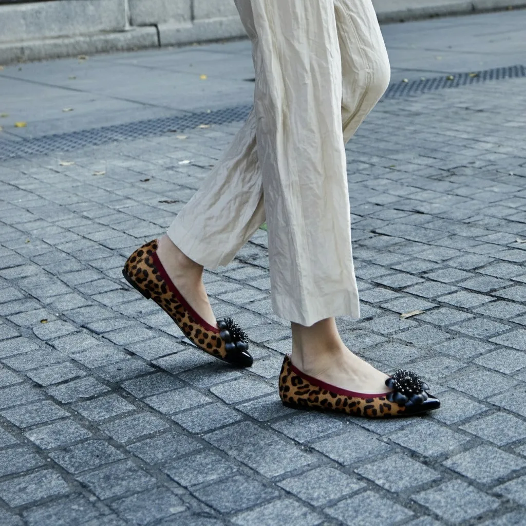 נעלי השירלי שלנו מפרווה בהדפס מנומר וחרטום שפיץ בלק שחור, מעוטרות בפרח ישדרגו את ההופעה שלכן במראה חייתי ונשי באותו הלוק