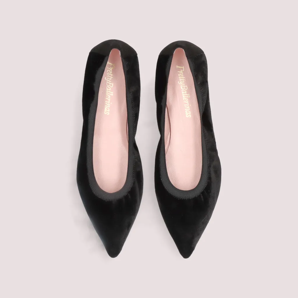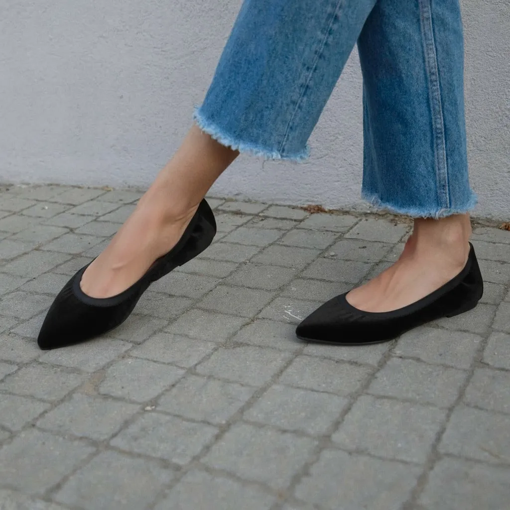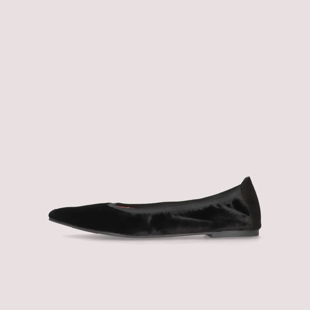 נעלי השירלי שלנו מקטיפה שחורה עם גומי שחור וחרטום שפיץ. בדגם זה מומלץ לקחת מידה יותר