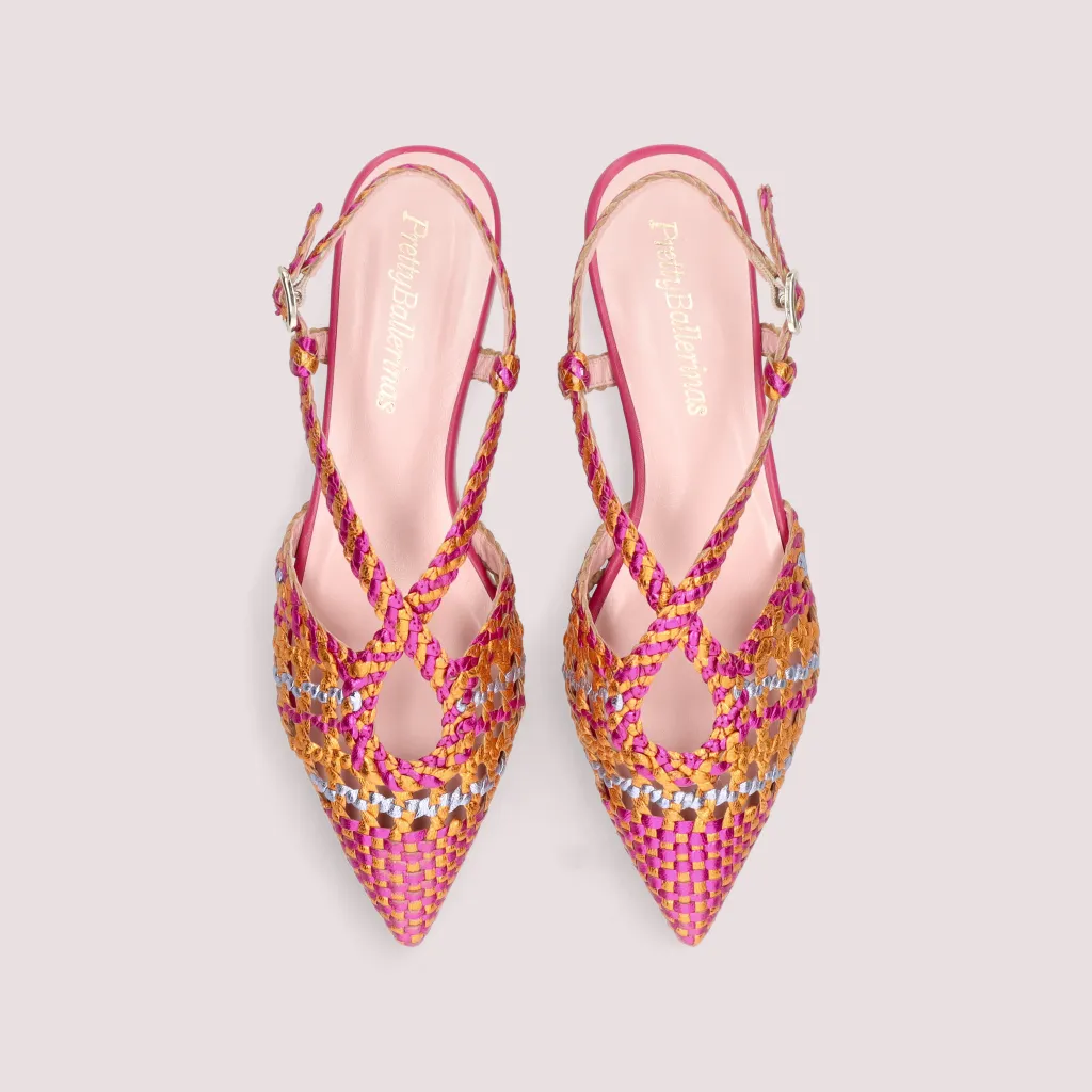 נעלי בלרינה מעור קלוע בצבעים עזים פוקסייה כתום ואפור. הנעל פתוחה מאחור עם רצועה ניתנת להתאמה וחרטום שפיץ . בדגם זה מומלץ להזמין חצי מידה יותר מהרגיל