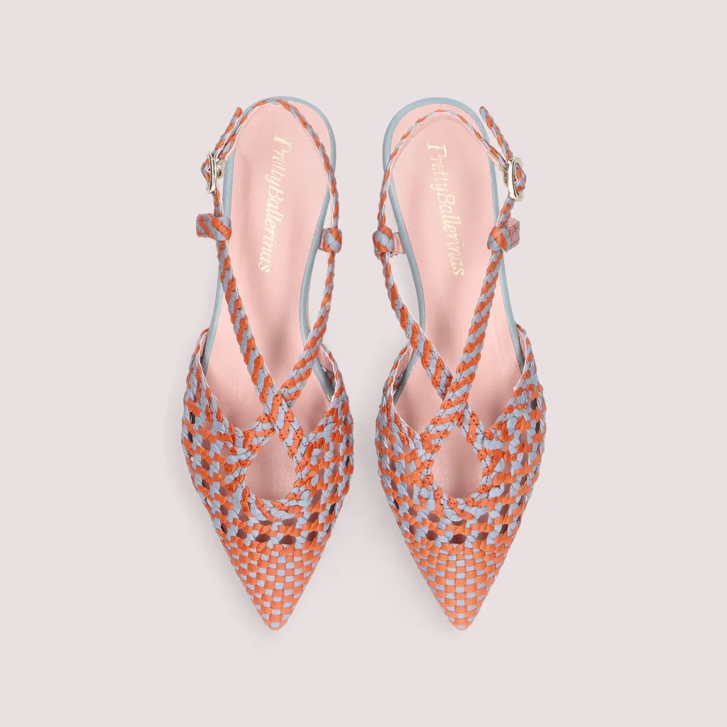 נעלי בלרינה מעור קלוע מט בצבעים כתום ותכלת. הנעל פתוחה מאחור עם רצועה ניתנת להתאמה וחרטום שפיץ . בדגם זה מומלץ להזמין חצי מידה יותר מהרגיל