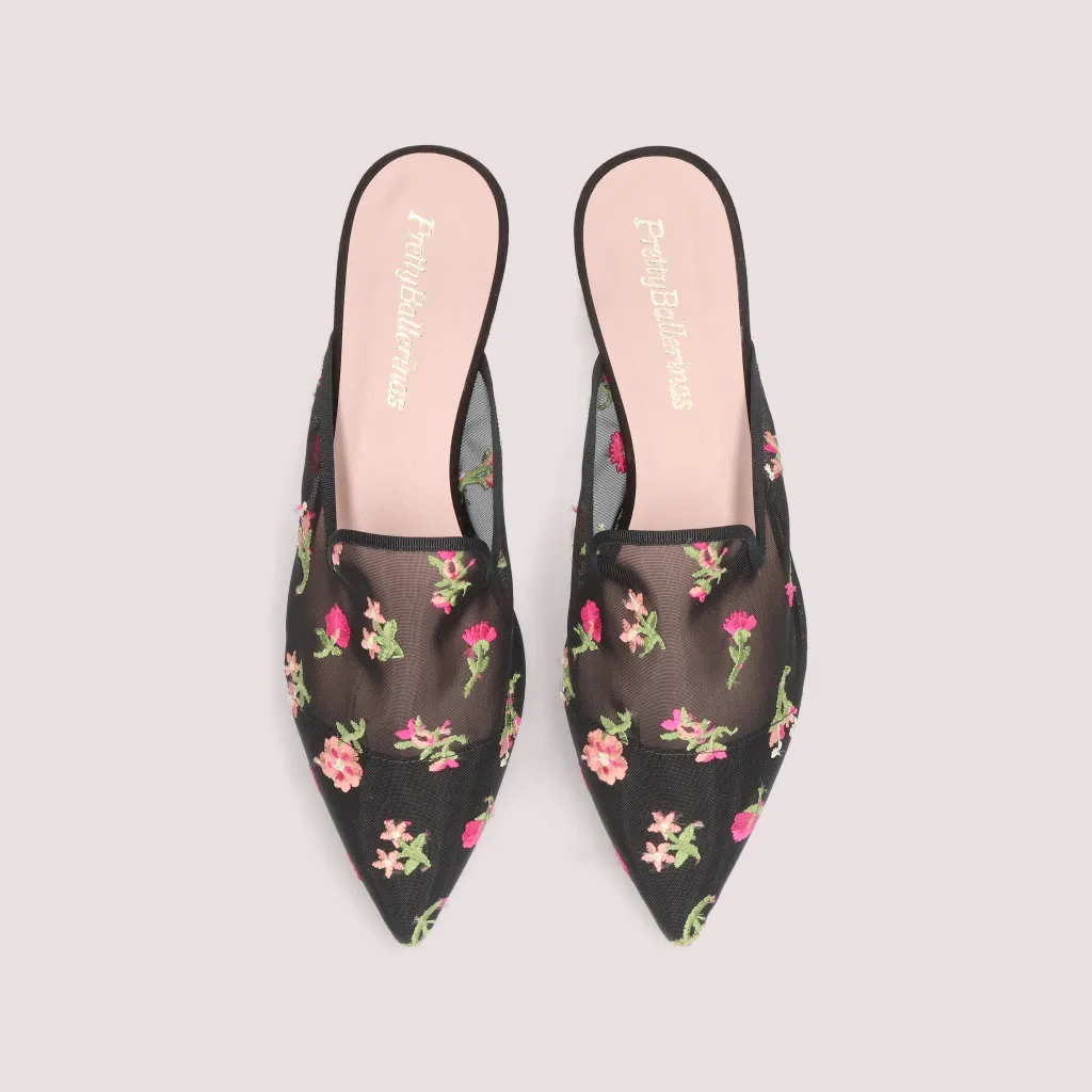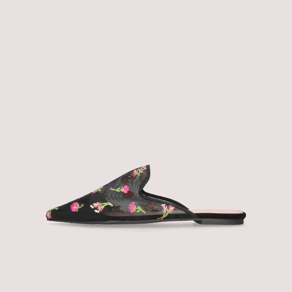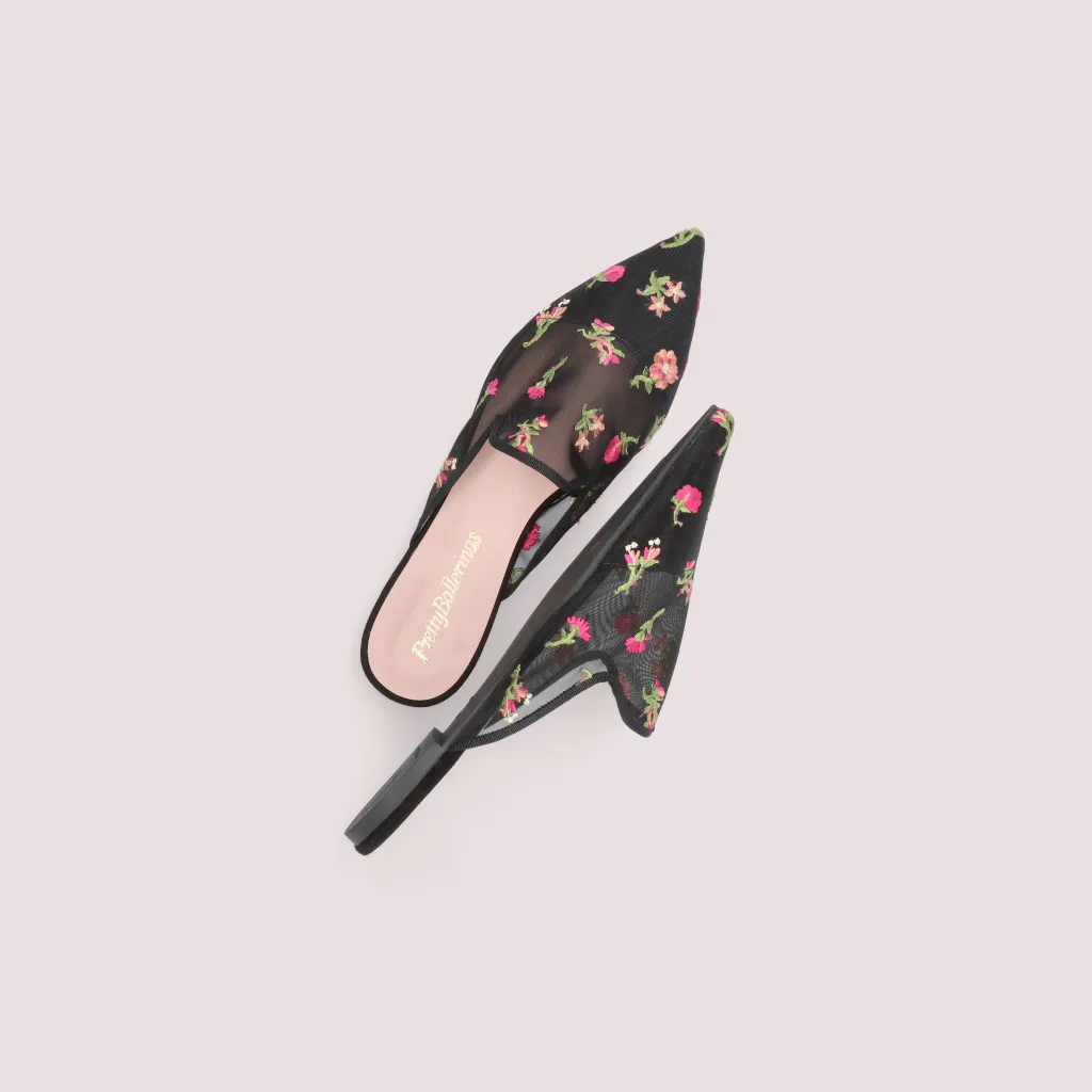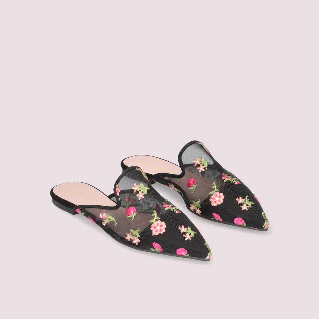 כפכפים מרשת שחורה מעוטרת בפרחים רקומים בצבעי אדום ורוד לבן וירוק וחרטום שפיץ