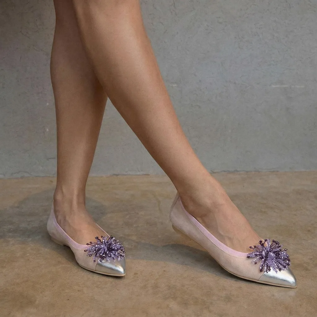 נעלי השירלי שלנו מזמש בצבע לילך וחרטום שפיץ מעור כסוף, עם גומי בצבע לילך מעוטר בפרח חרוזים סגול מתיאמות לנשים שמחפשות נעלי בובה עדינות עם נגיעה קיצית ויוקרתית
