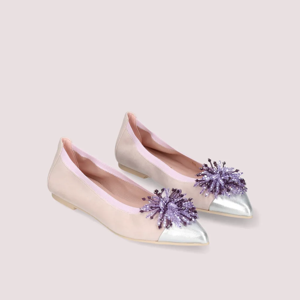 נעלי השירלי שלנו מזמש בצבע לילך וחרטום שפיץ מעור כסוף. עם גומי בצבע לילך מעוטר בפרח חרוזים סגול. בדגם זה מומלץ לקחת מידה יותר