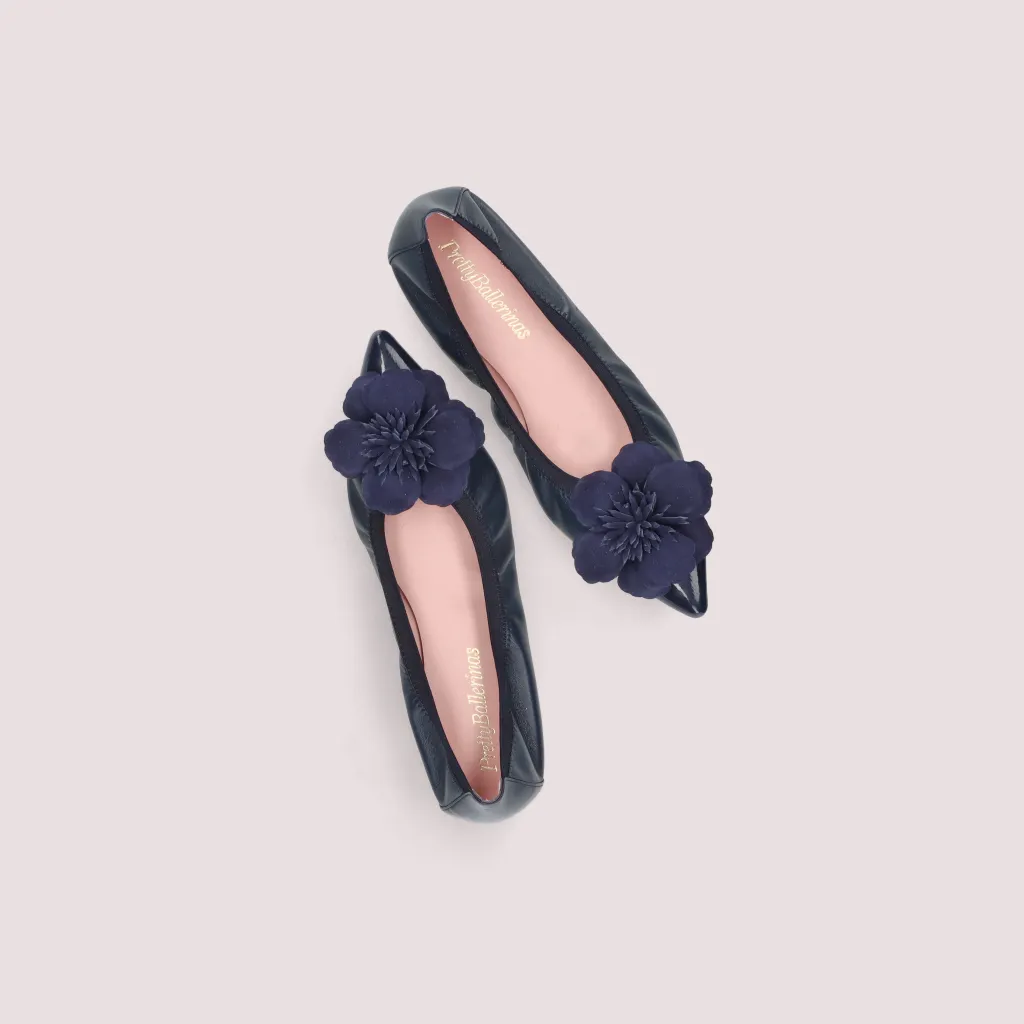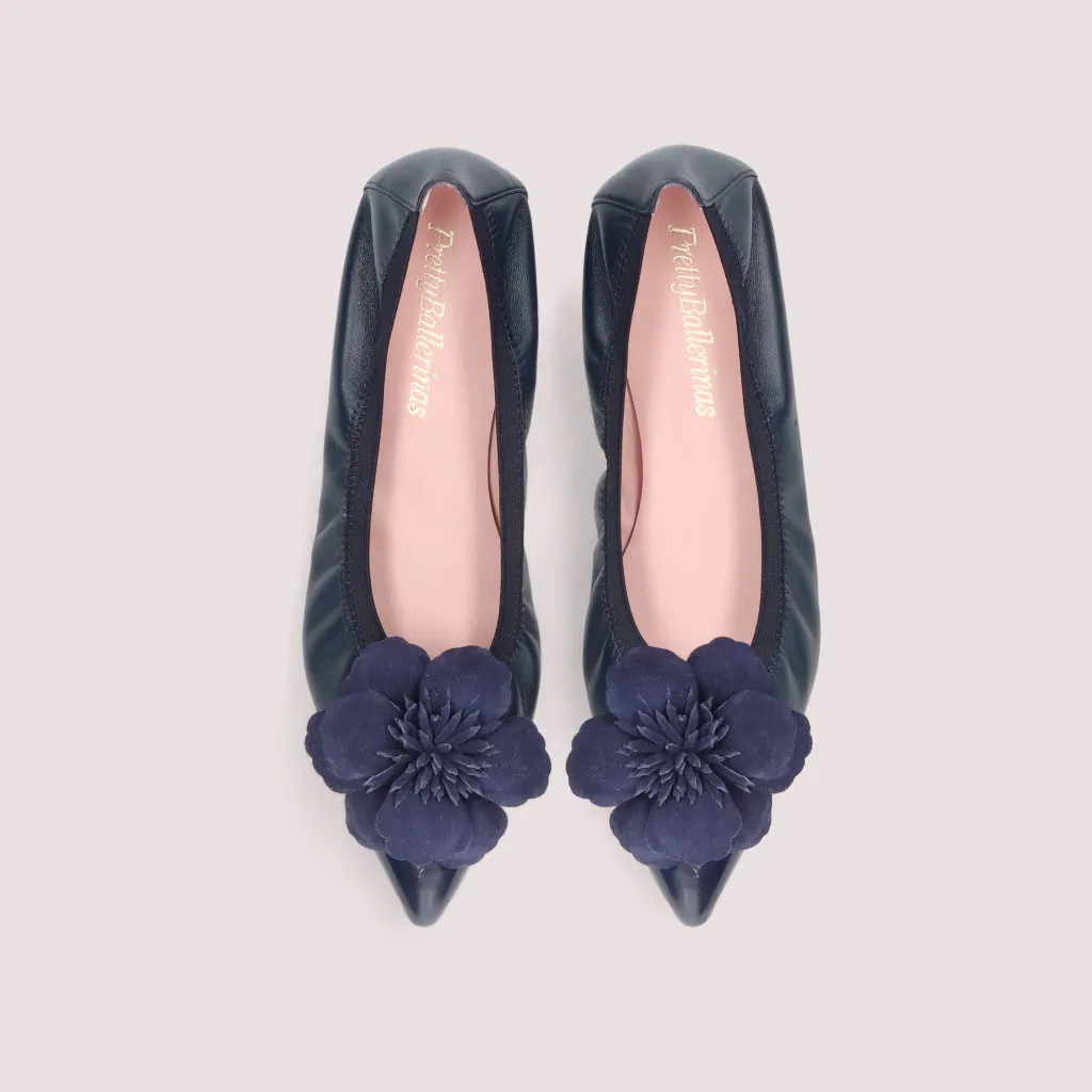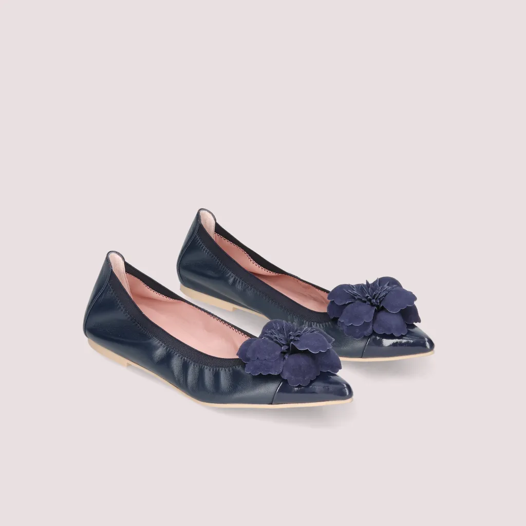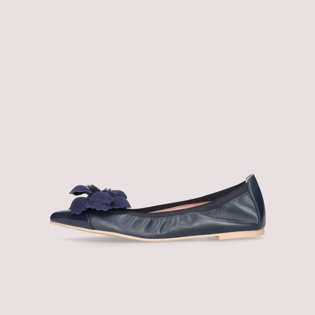 נעלי השירלי שלנו מעור מט כחול וחרטום שפיץ בלק כחול. עם פרח זמש כחול וגומי כחול. בדגם זה מומלץ לקחת מידה יותר