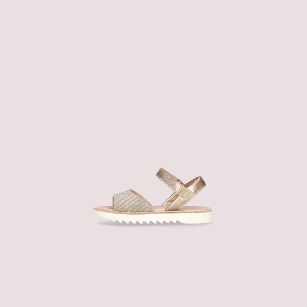 סנדלים לילדות מטקסטיל כסף מנצנץ ורצועה מעור זהוב הם הסנדלים שהילדות שלכן יתאהבו בהם ברגע