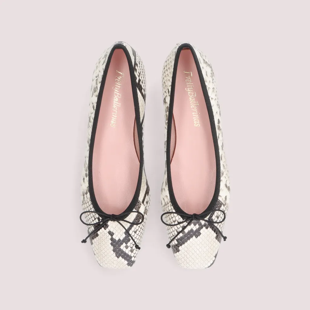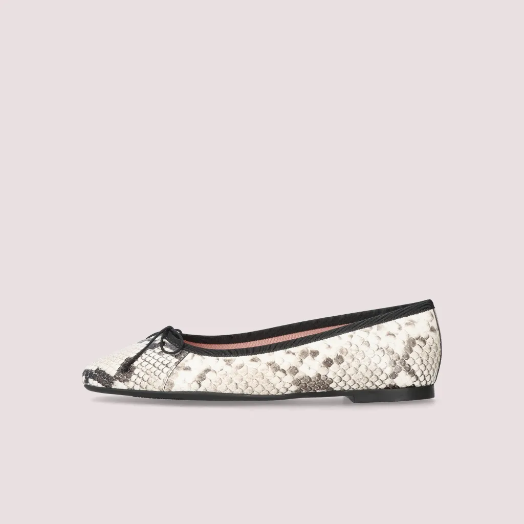 נעלי בלרינה מעור בהדפס מנוחש בגווני הפנינה והכסף עם פפיון וסרט שחורים