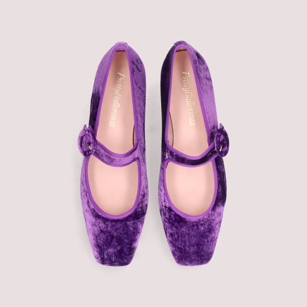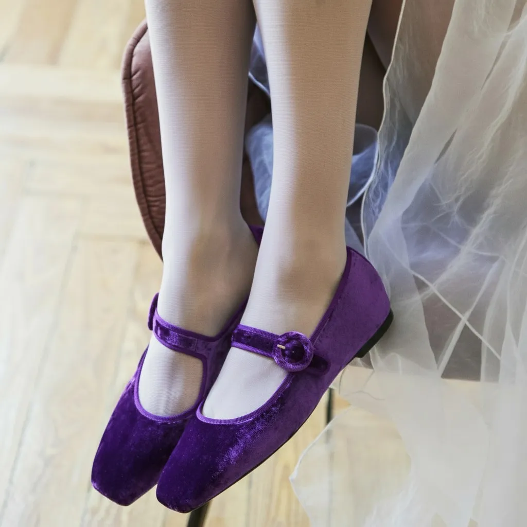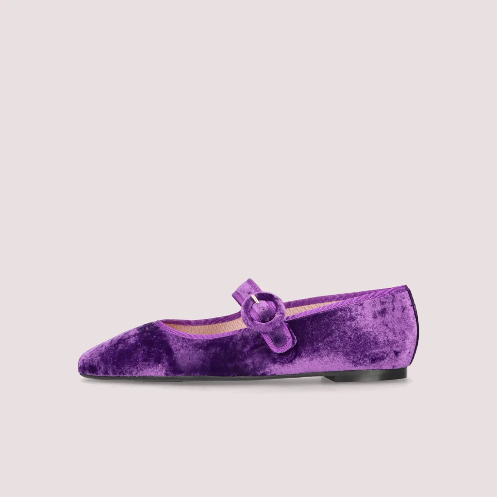 נעלי בלרינה מקטיפה בצבע סגול מלכותי עם רצועה ואבזם, יעניקו ללוק שלכן טוויסט צבעוני וייחודי וישדרגו כל הופעה ברגע