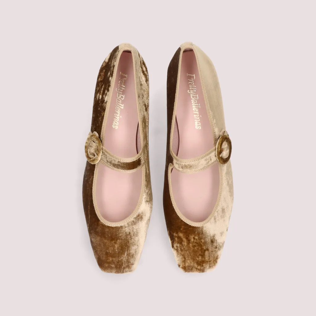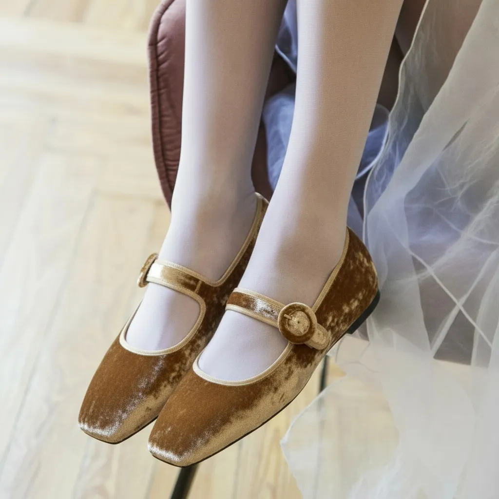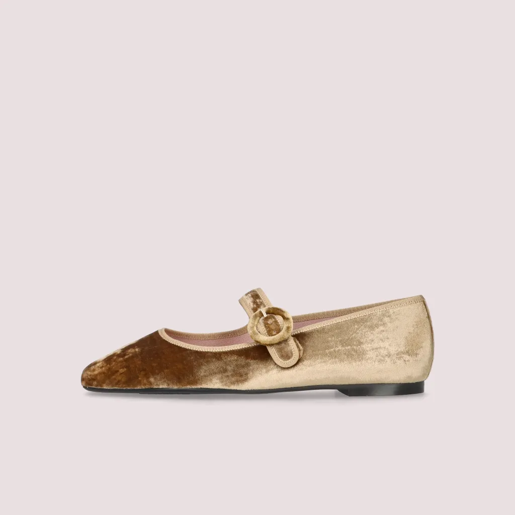 נעלי בלרינה מקטיפה מוזהבת עם רצועה ואבזם