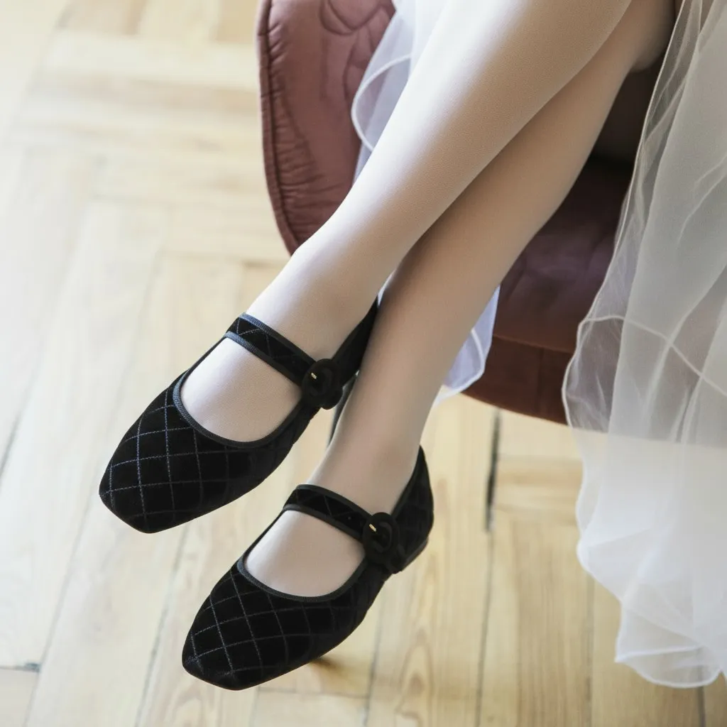 נעלי בלרינה מקטיפה שחורה עם תיפורים ורצועת קטיפה שחורה, עם סרט ושרוך שחורים הן נעליים שיוסיפו טאצ’ יוקרתי לכל לוק, גם ביומיום וגם באירועים מיוחדים