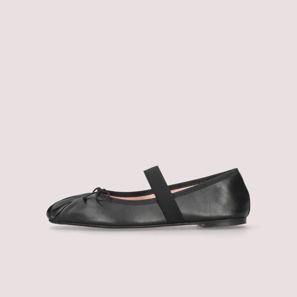 נעלי בלרינה מעור מט שחור עם כיווצים בחרטום הנעל ורצועת גומי שחורה