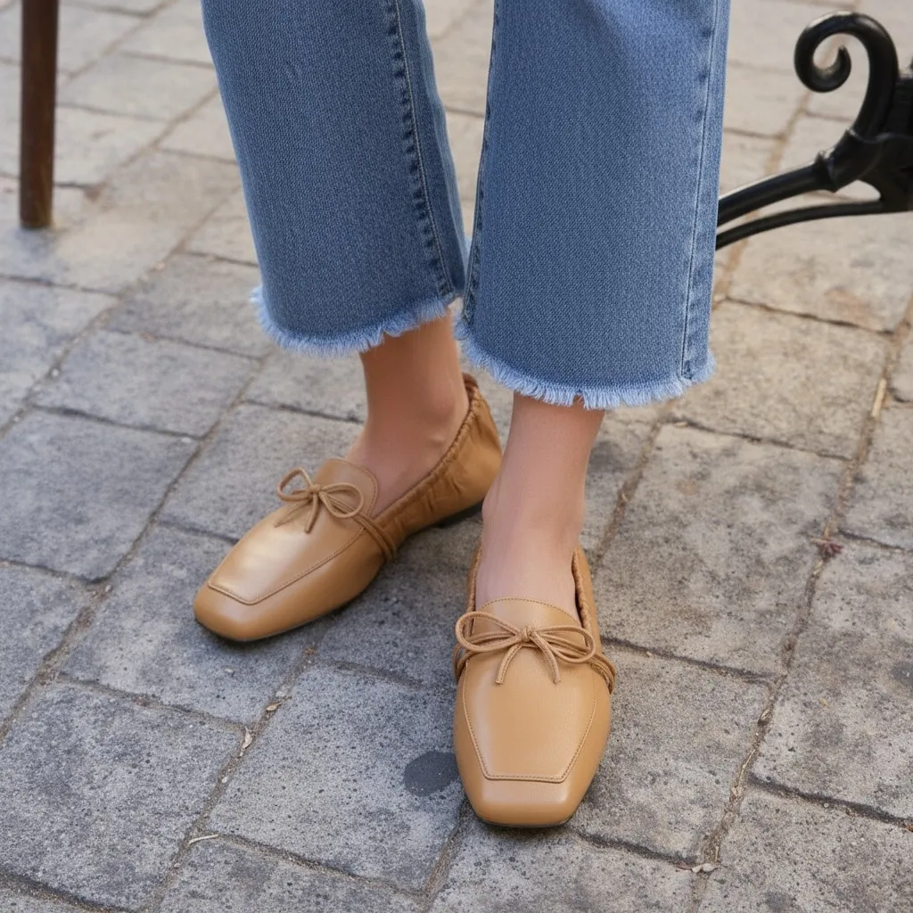 מוקסין מעור מט בצבע כאמל עם סרט קשירה מסביב לנעל – בחירה מושלמת למראה נשי ואלגנטי שמתאים לכל שעות היום