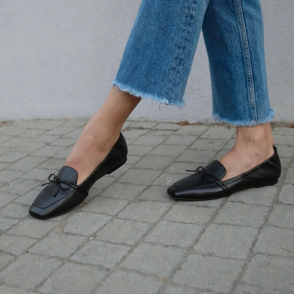 מוקסין מעור מט שחור עם סרט קשירה מסביב לנעל מתאים לנשים שמחפשות נוחות ועיצוב מדויק לכל סיטואציה