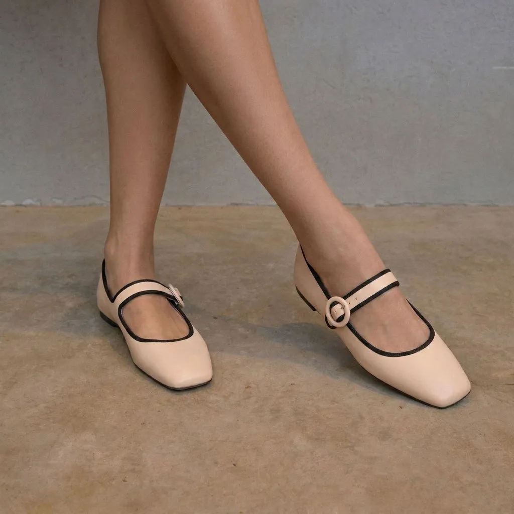 נעלי בלרינה מעור מט בצבע ניוד, עם רצועה תואמת ואבזם וסרט שחור – מדויקות, קלאסיות ונשיות