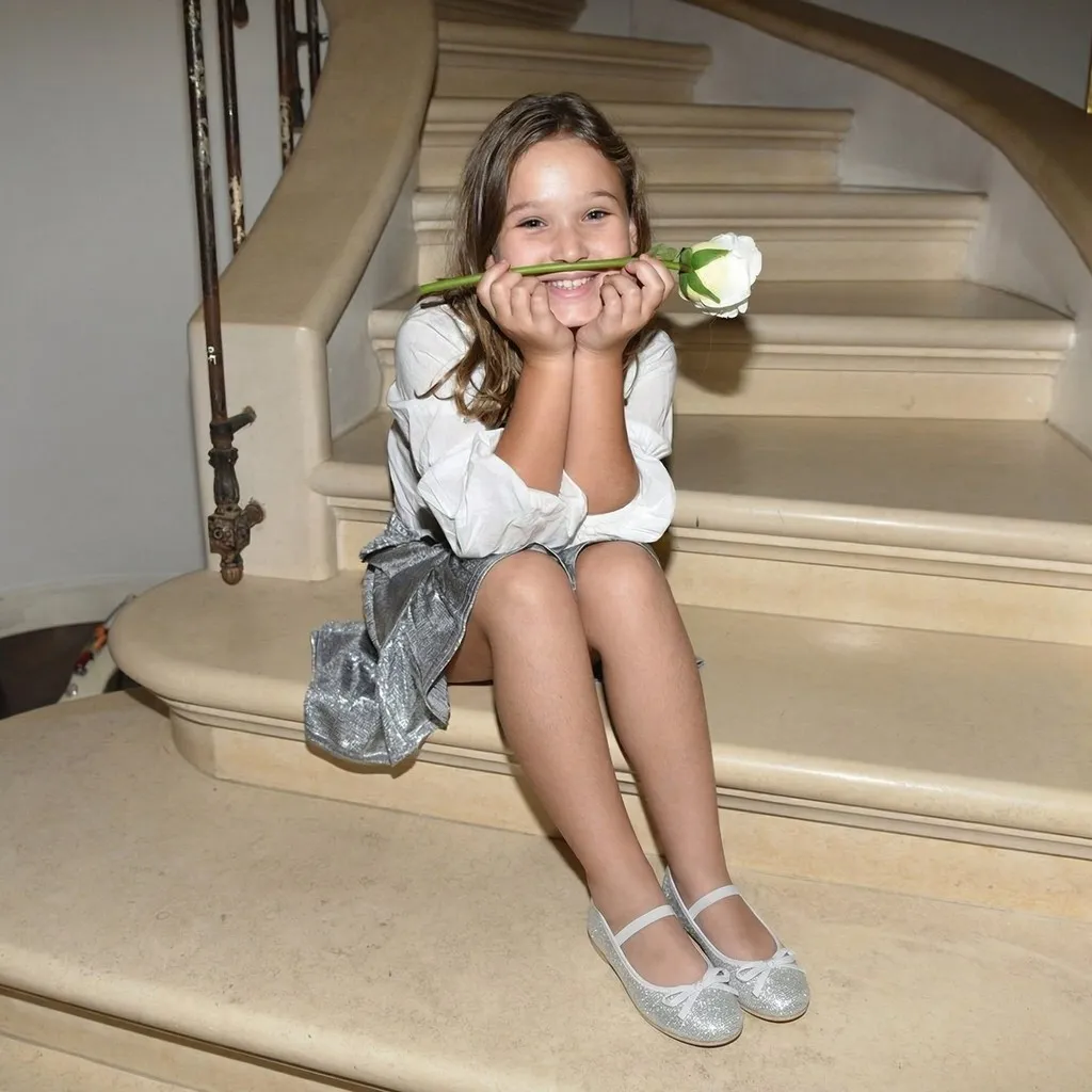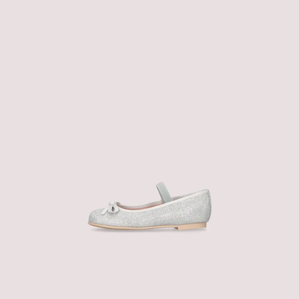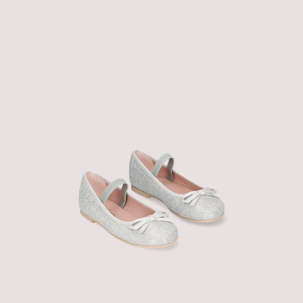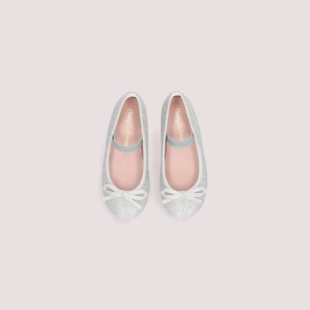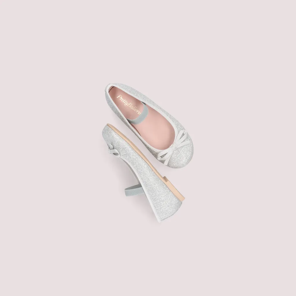 נעלי בלרינה לילדות מטקסטיל כסוף ולבן מנצנץ עם פפיון תואם