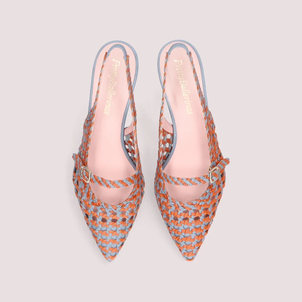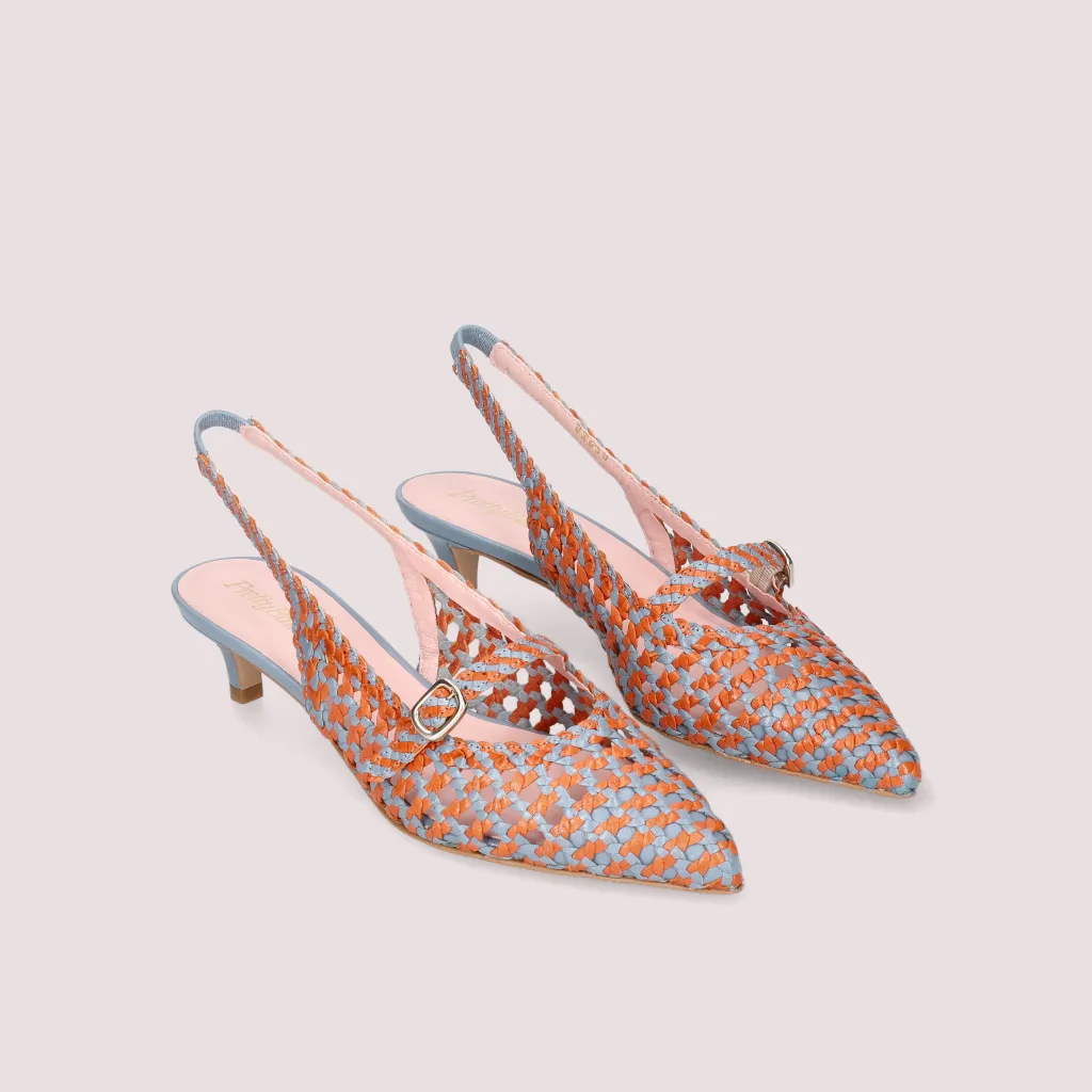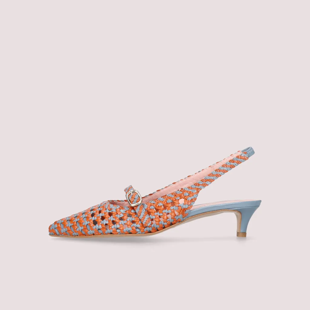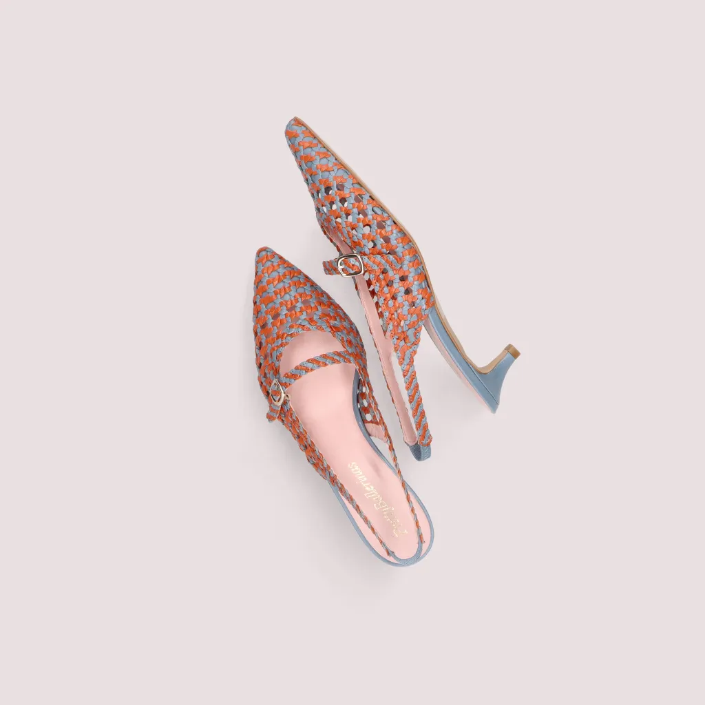 נעלי עקב מעור קלוע בצבע כתום ותכלת עם עקב קיטן בגובה של 4 סמ’. הנעל פתוחה מאחור עם רצועה וכן רצועה עליונה ניתנת להתאמה וחרטום שפיץ . בדגם זה מומלץ להזמין חצי מידה יותר מהרגיל