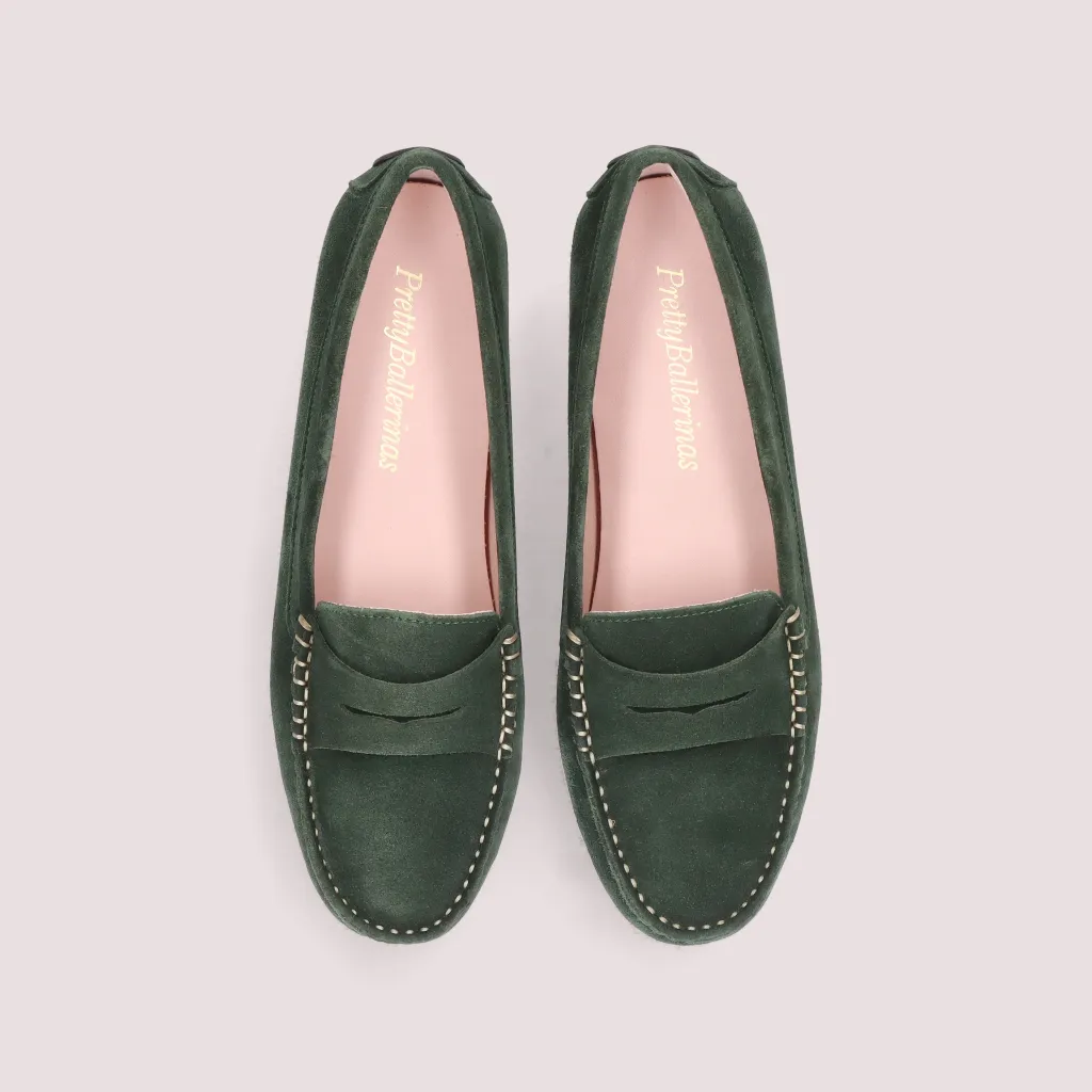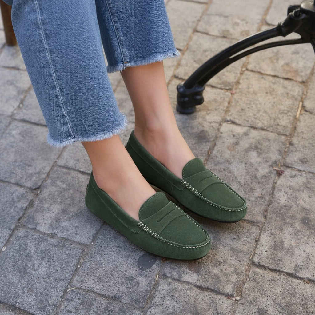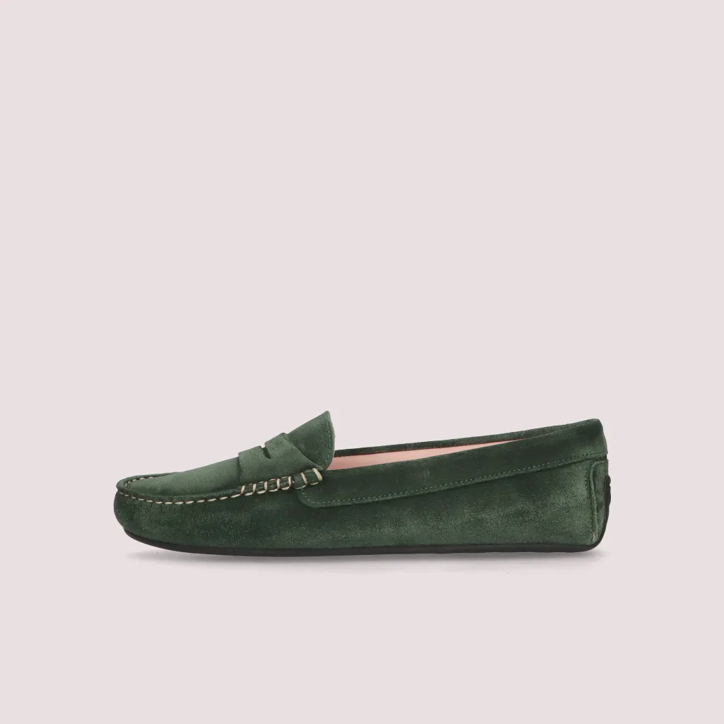 מוקסין מזמש בצבע ירוק בקבוק ופס עליון תואם הן נעליים מלאות קסם שיגרמו לכל לוק להרגיש שלם ומושקע