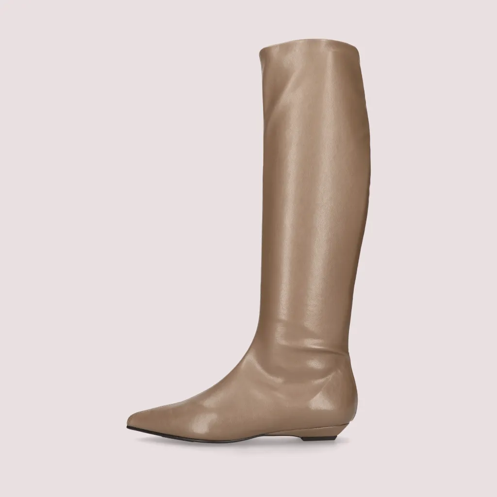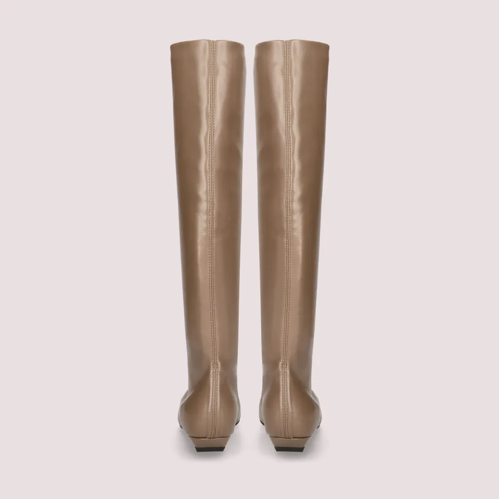 מגף מטקסטיל סטרץ’ מיוחד בצבע טאופ, עם חרטום שפיץ ועקב בגובה 2 ס”מ – מראה קלאסי ונצחי של מגף גבוה שכל אחת חייבת בארון הנעליים שלה