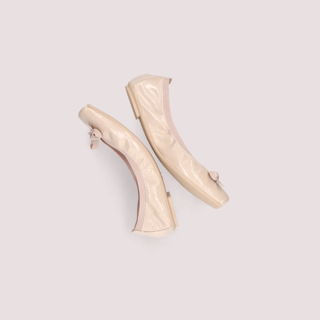נעלי בלרינה מעור לק בצבע ורוד עם גומי ופפיון תואמים