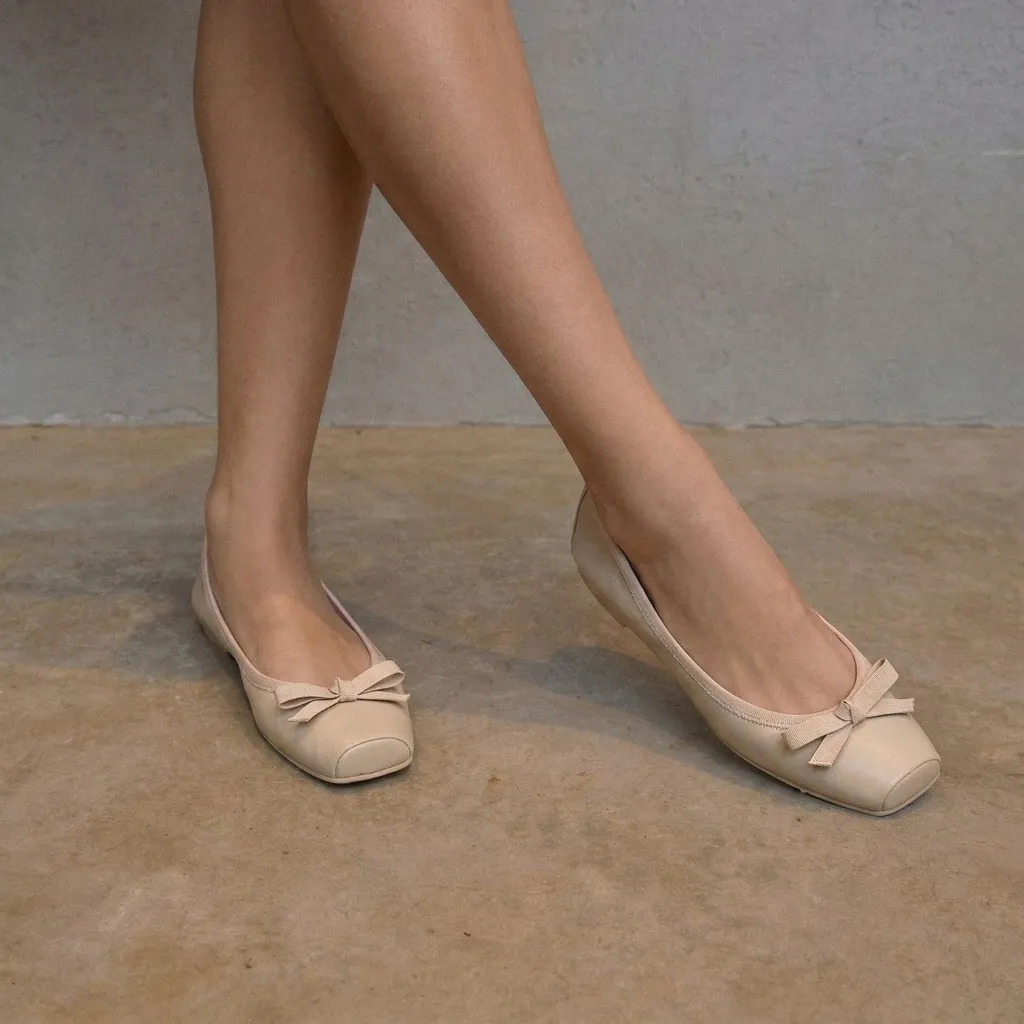 נעלי בלרינה מעור מט בצבע קאמל עם גומי ופפיון תואמים הן נעלי הבובה שכל אחת מאיתנו צריכה בארון הנעליים שלה
